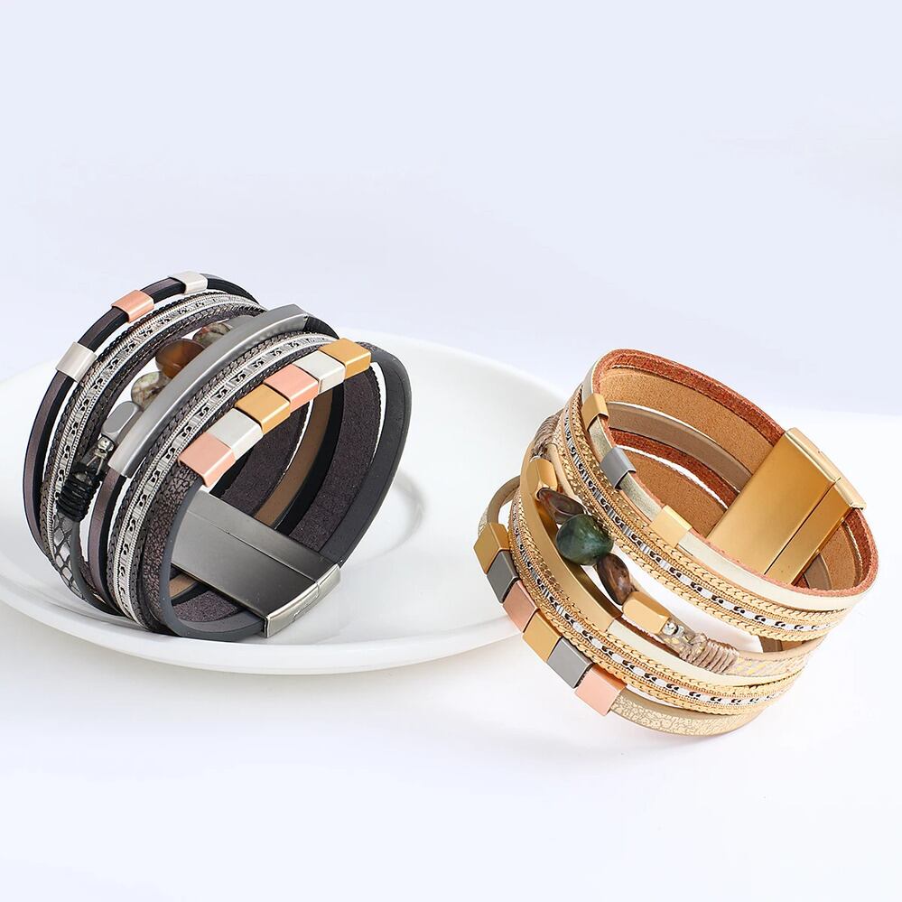 かわいい ナチュラル ストーン 純正 レザー ブレスレット レディース ファッション 四角 スクエア メタル チャーム チェーン ラップ バングル ジュエリー