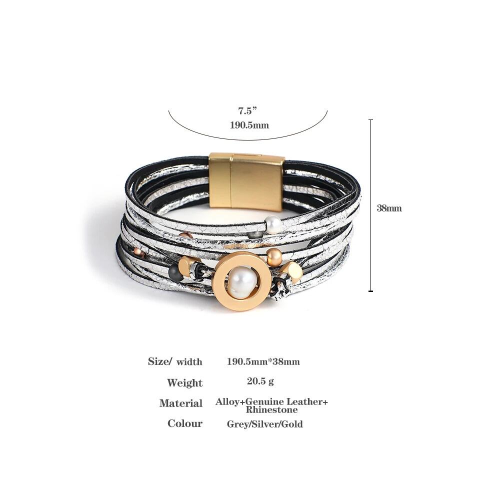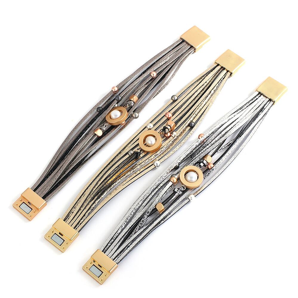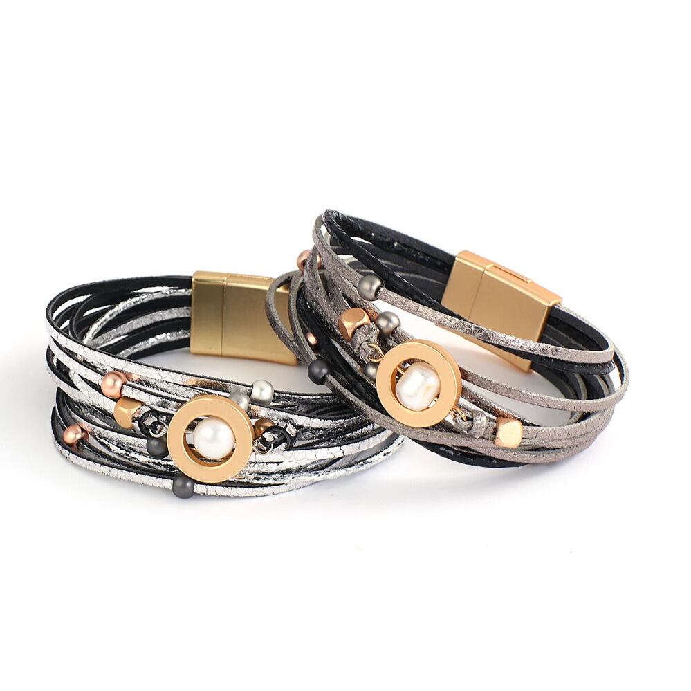 幾何学 パール ビーズ メタル ラウンド チャーム レザー ブレスレット レディース 多層 マルチレイヤー ラップ バングル ステートメント ジュエリー