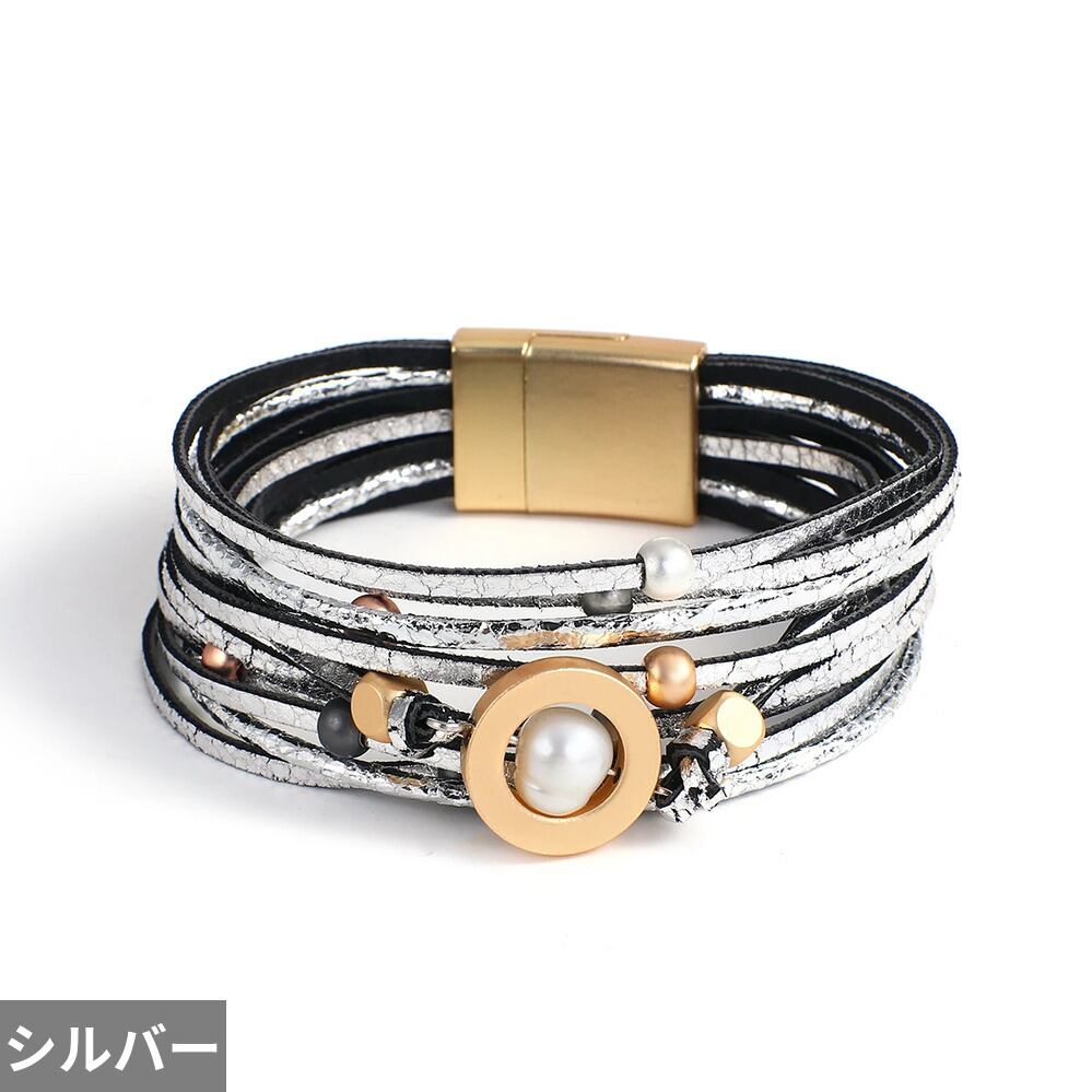 チャーム バングル ブレスレット ラウンド レザー ビーズ メタル パール レディース 幾何学