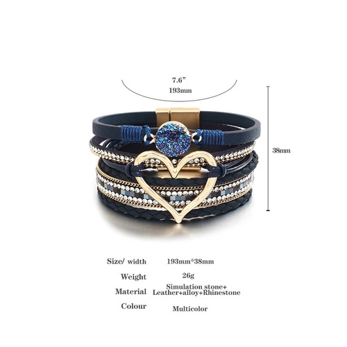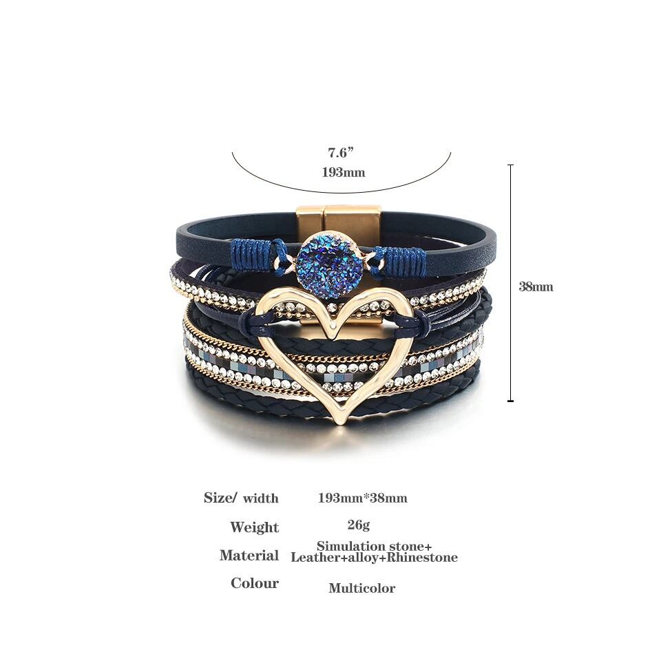 メタル Love ハート チャーム レザー ブレスレット レディース ファッション ラインストーン 編組 ラップ バングル ジュエリー