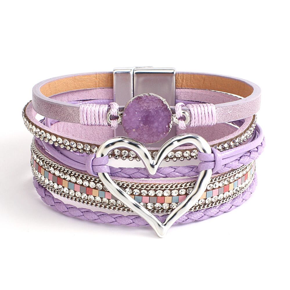 エレガント 紫 パープル レザー ブレスレット レディース メンズ ボヘミアン チャーム クリスタル ビーズ ハート カフ バングル ジュエリー ギフト