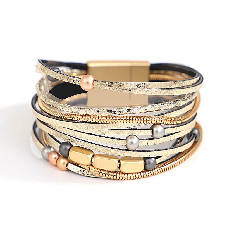 ビンテージ 多数 レイヤー レザー ブレスレット レディース メンズ チャーム ビーズ メタル チェーン ラップ ファッション ジュエリー