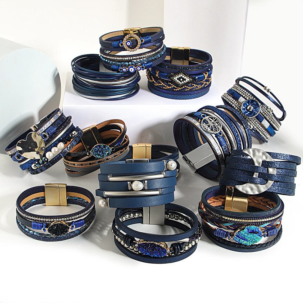 ファッションブレスレット: ブルー多層巻きレザーブレスレット