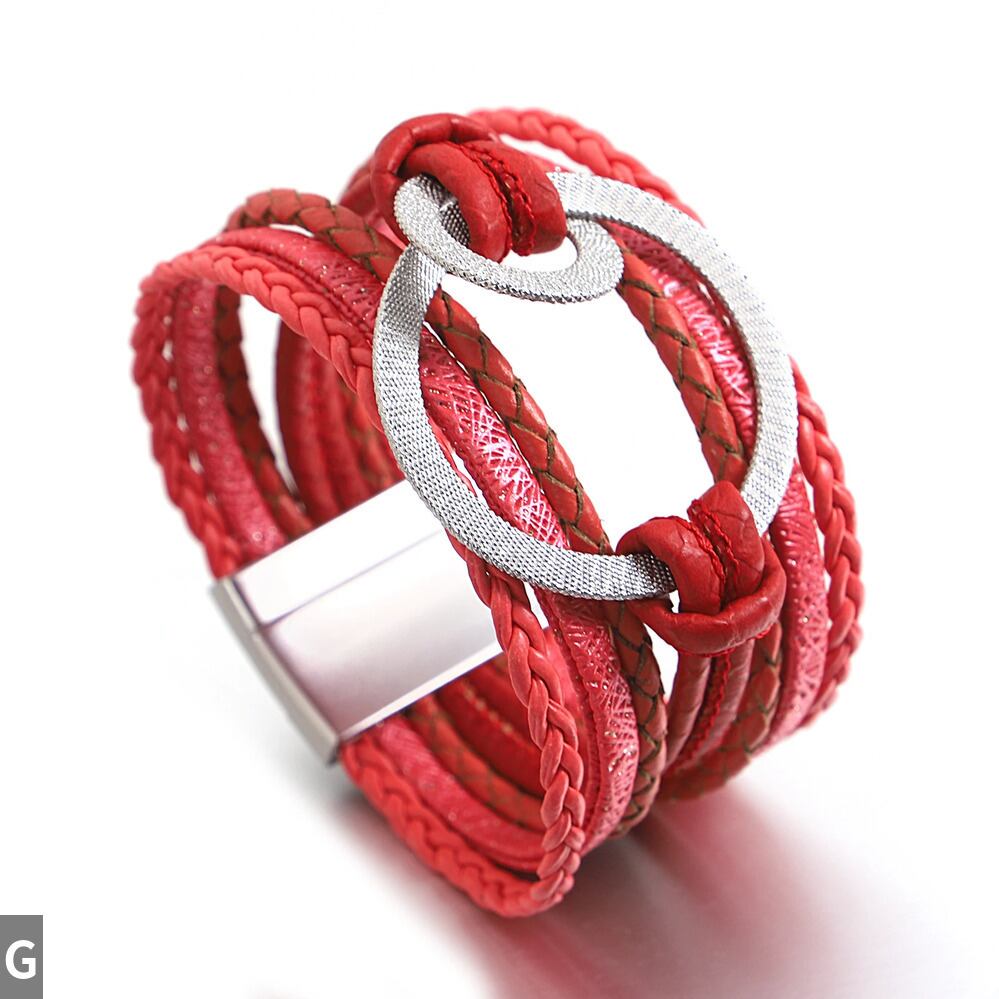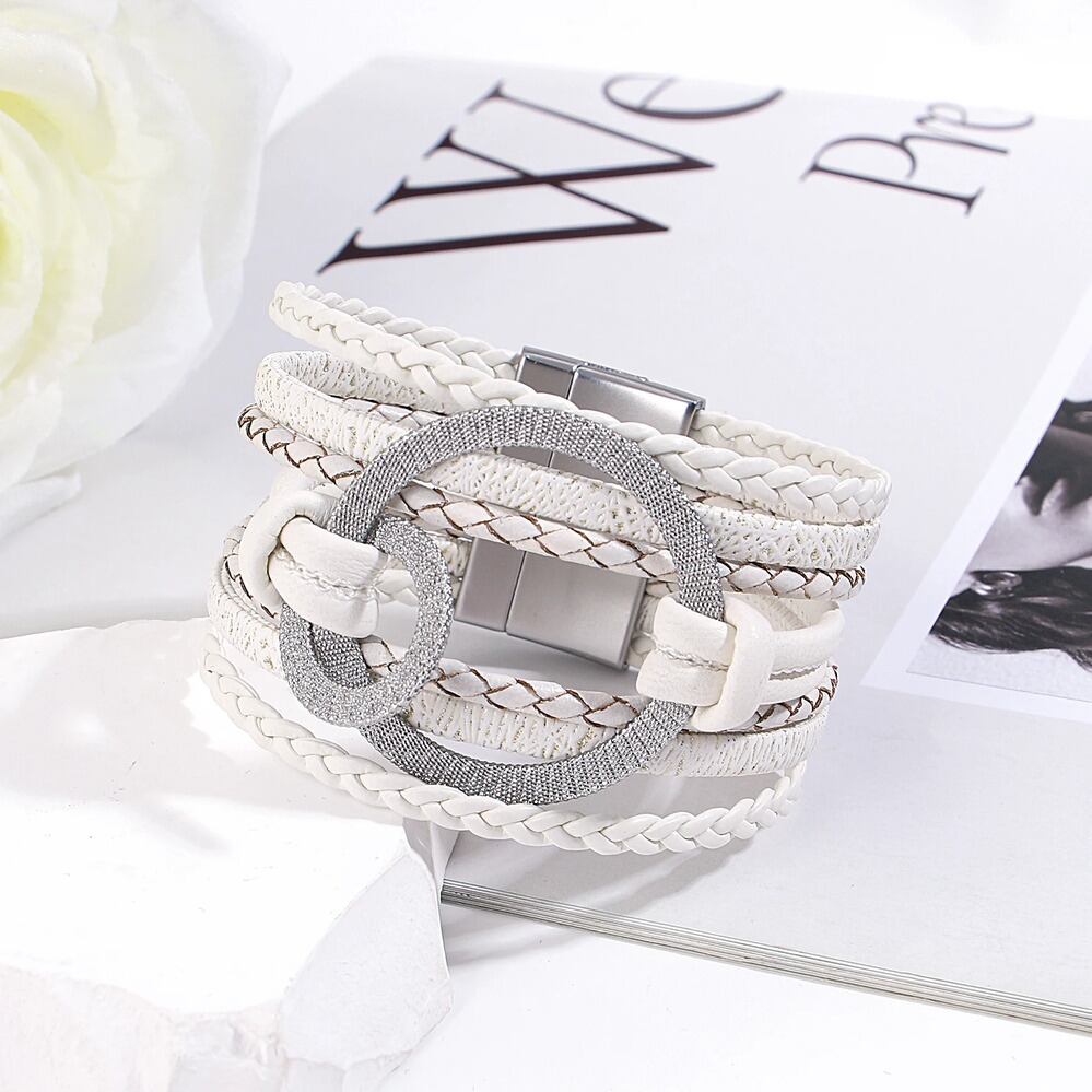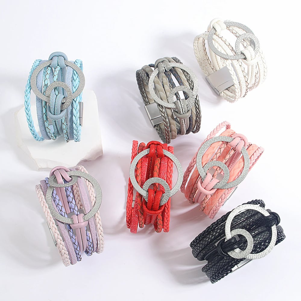 ハンドメイド 編組 シルバー カラー サークル レザー ブレスレット レディース 多層 マルチレイヤー ラップ 幅  バングル チャーム ジュエリー