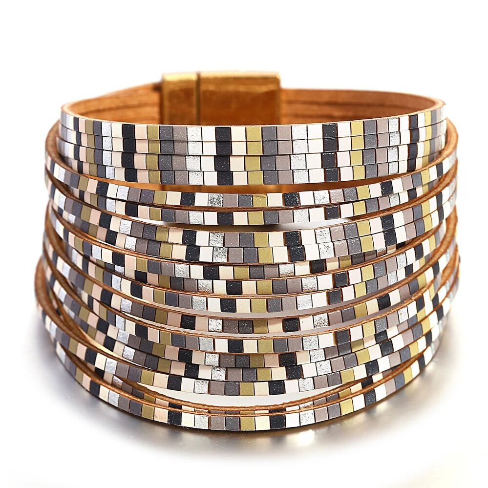 ボヘミアン ミックス カラー 格子縞 市松 レザー ブレスレット レディース ファッション スリム ストリップ 多層 マルチレイヤー 幅 ラップ チャーム ジュエリー