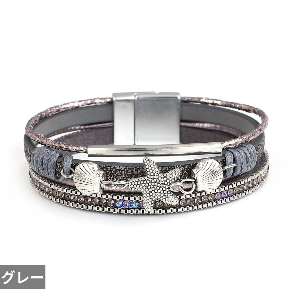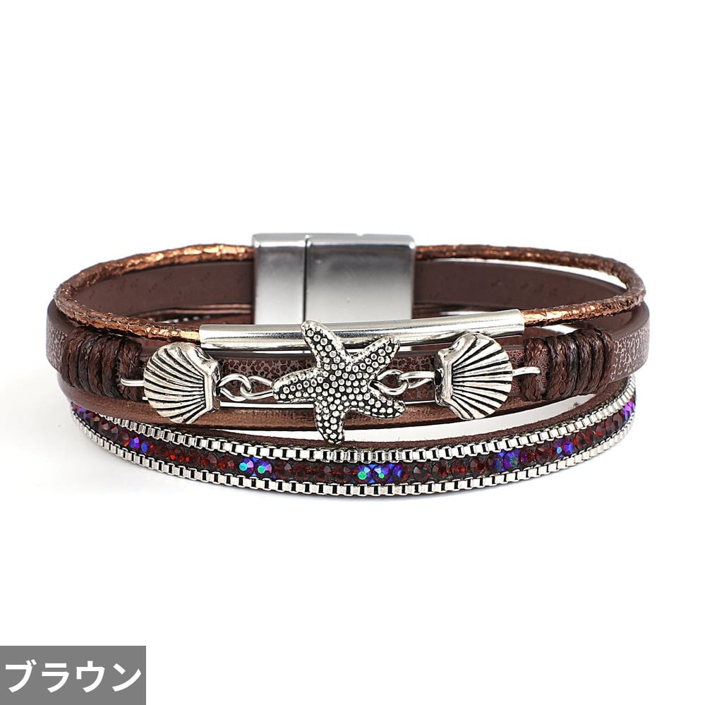 チャーム ヒトデ 動物 アニマル シェル 貝殻 レザー ブレスレット レディース メンズ BOHO メタル チューブ クリスタル ビーズ チェーン  バングル ビーチ ジュエリー