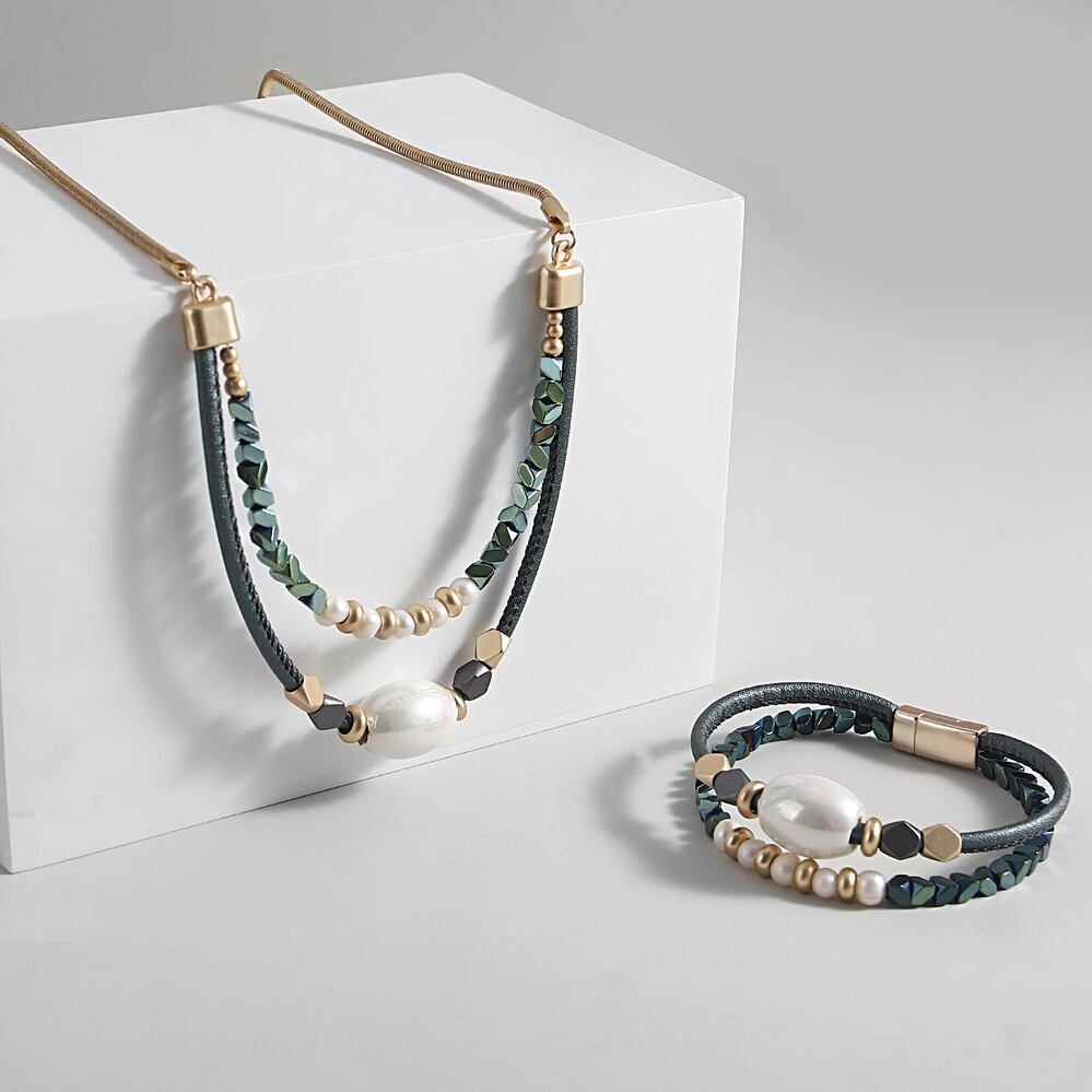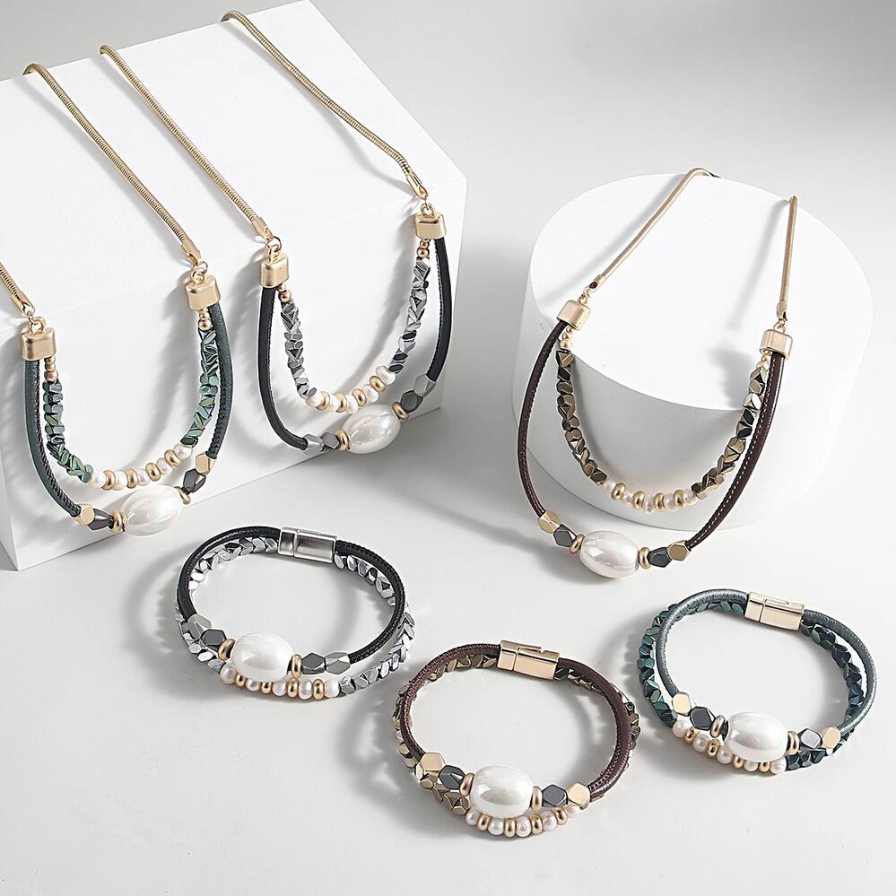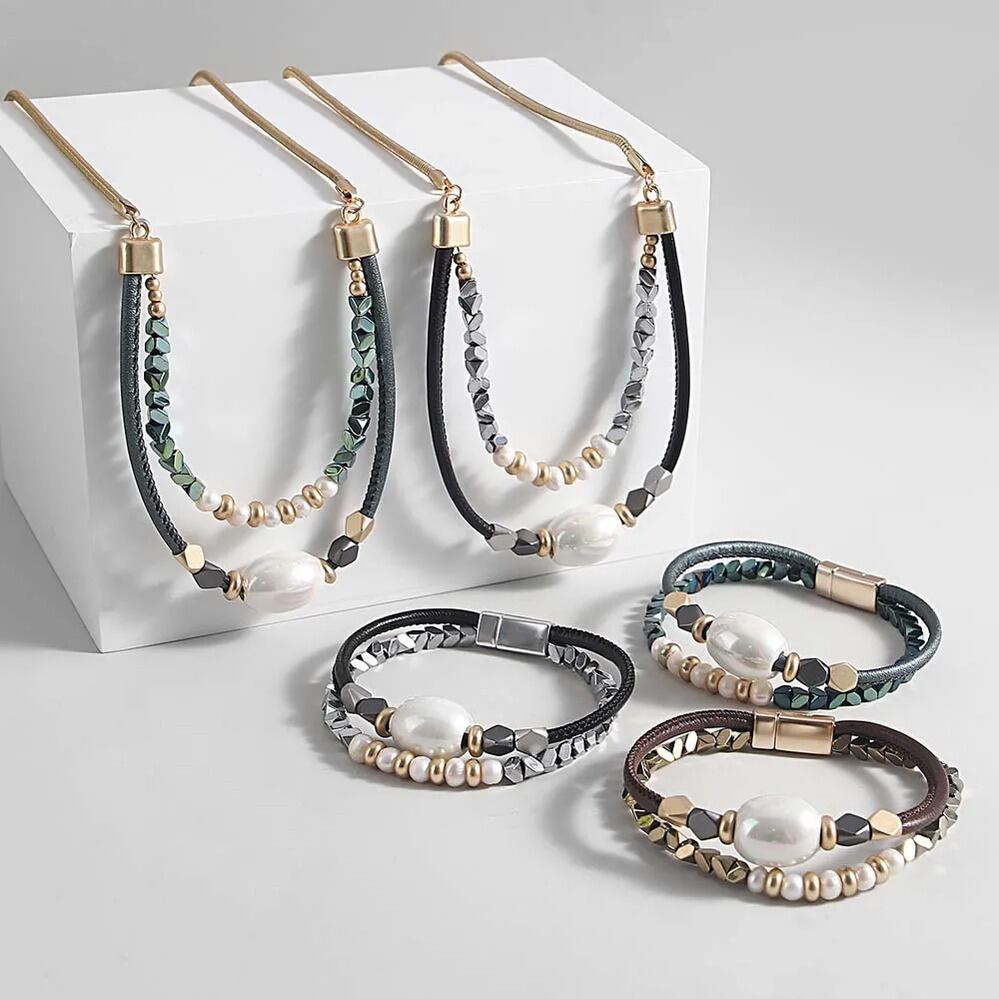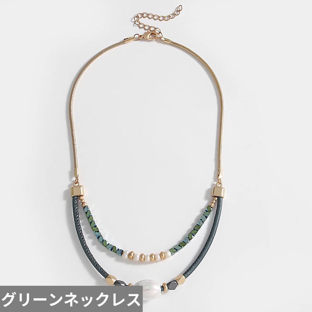 イレギュラー ストーン パール ビーズ ブレスレット ネックレス ボヘミアン チャーム ダブル レイヤー レザー メンズ レディース ジュエリー