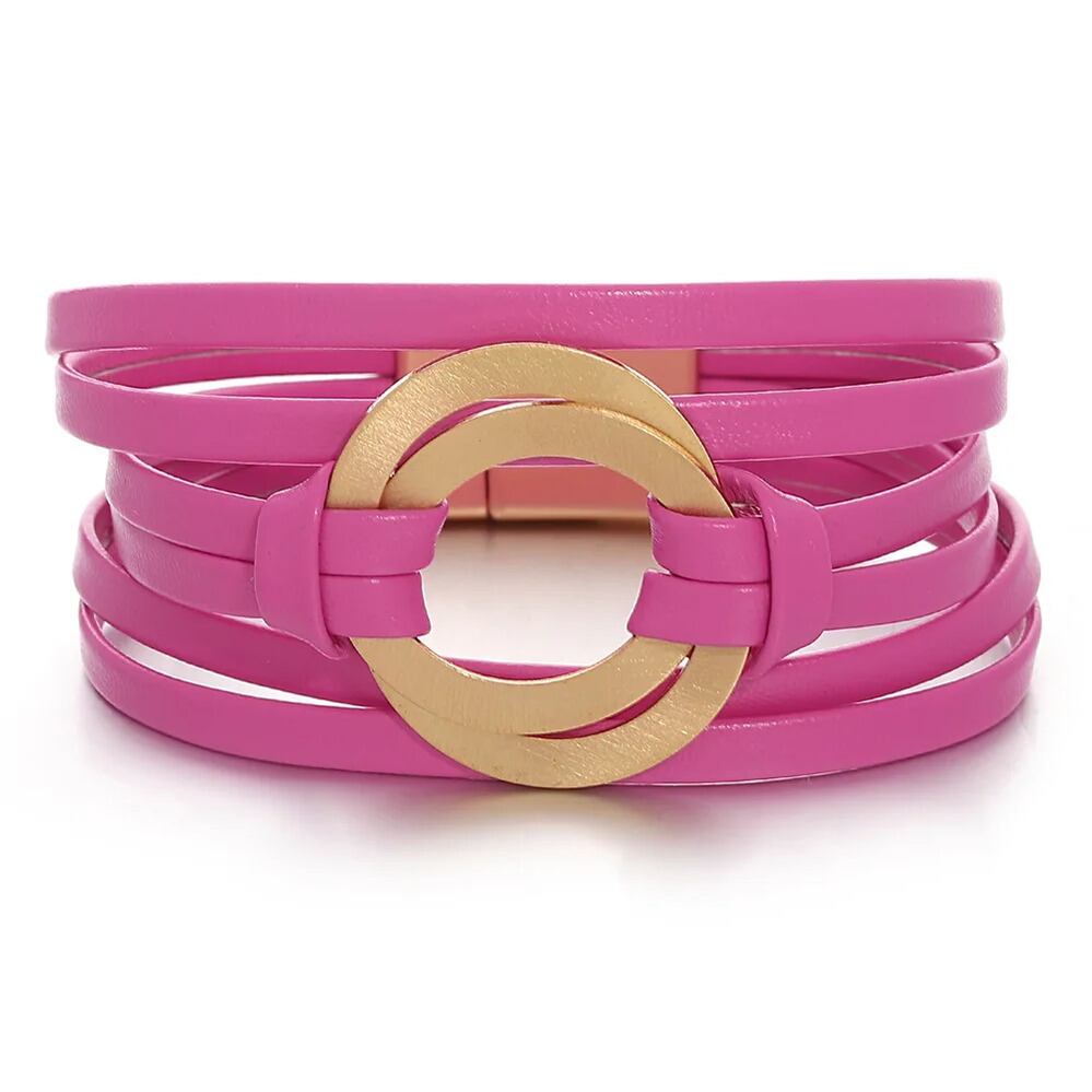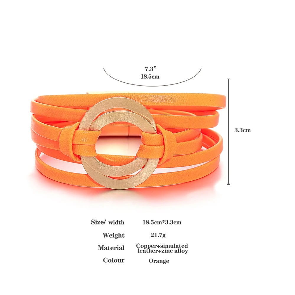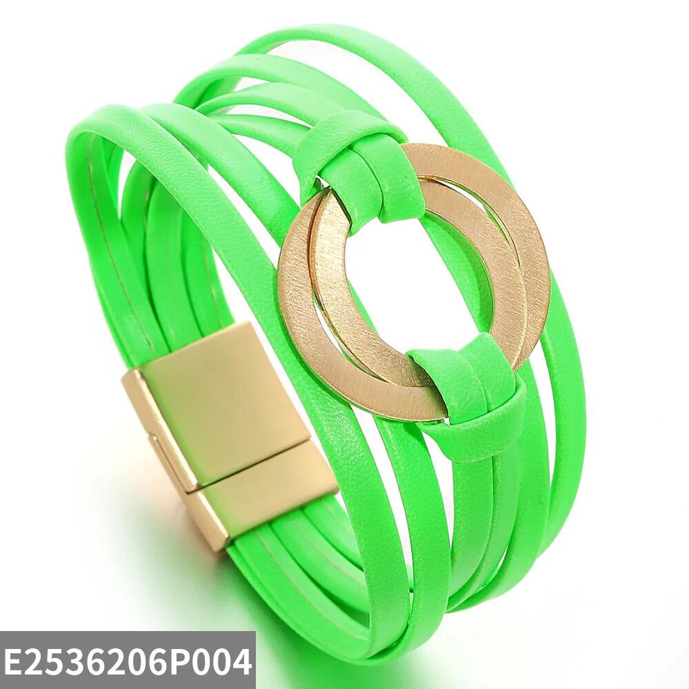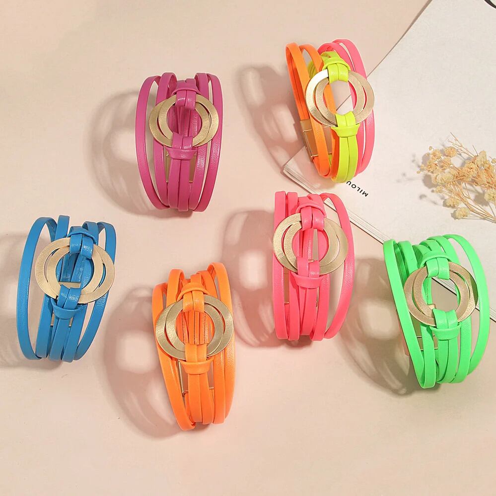 蛍光 カラフル レザー ブレスレット レディース ファッション 透かし ダブル サークル 多層 マルチレイヤー ラップ パーティ ジュエリー