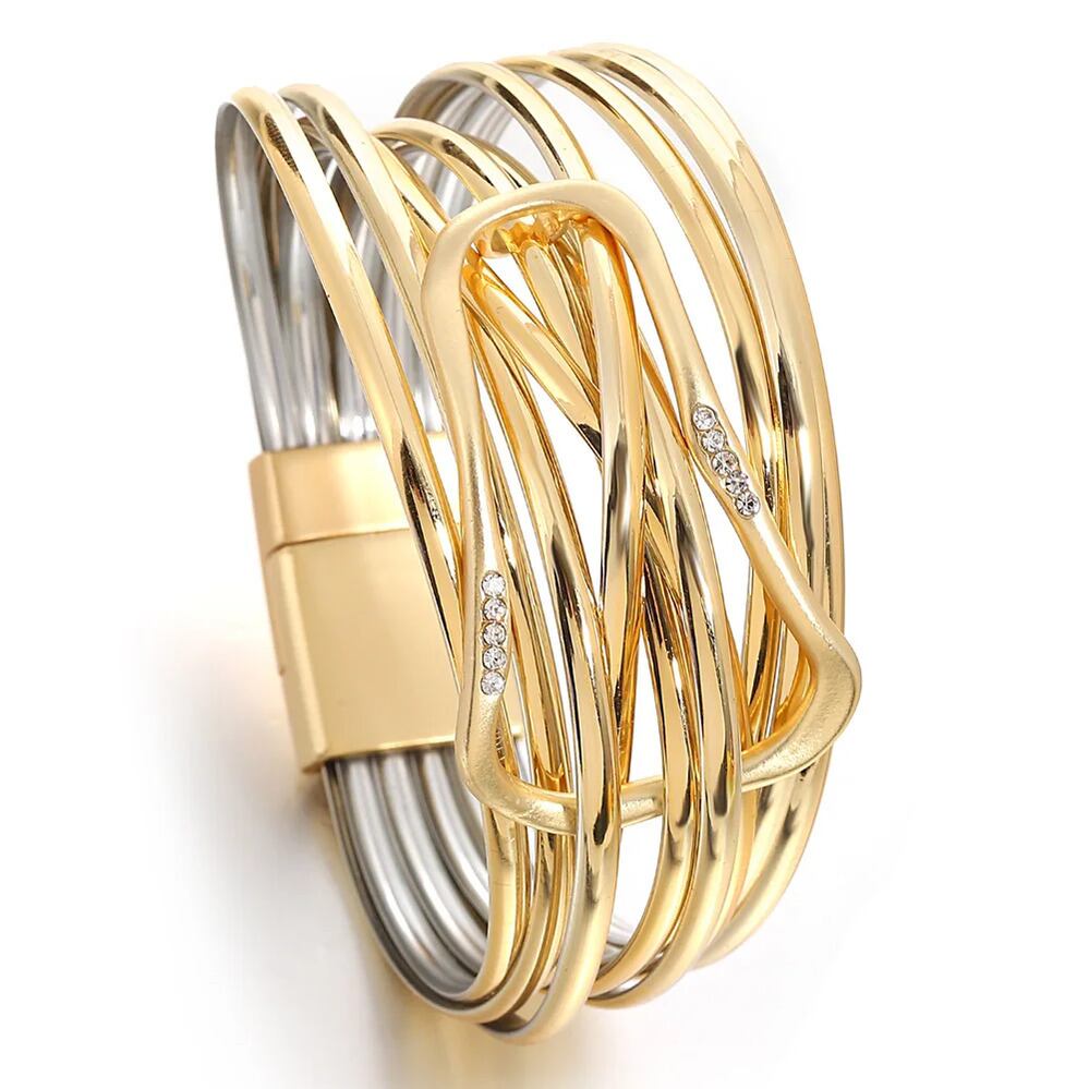 イレギュラー 幾何学 メタル ラップ ブレスレット レディース トレンド パンク ゴールド カラー 多層 マルチレイヤー レザー バングル
