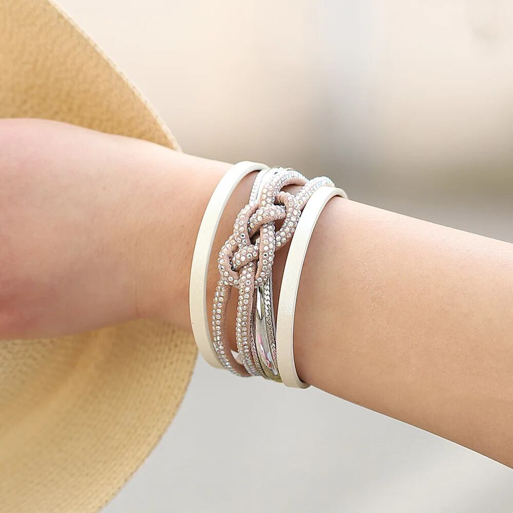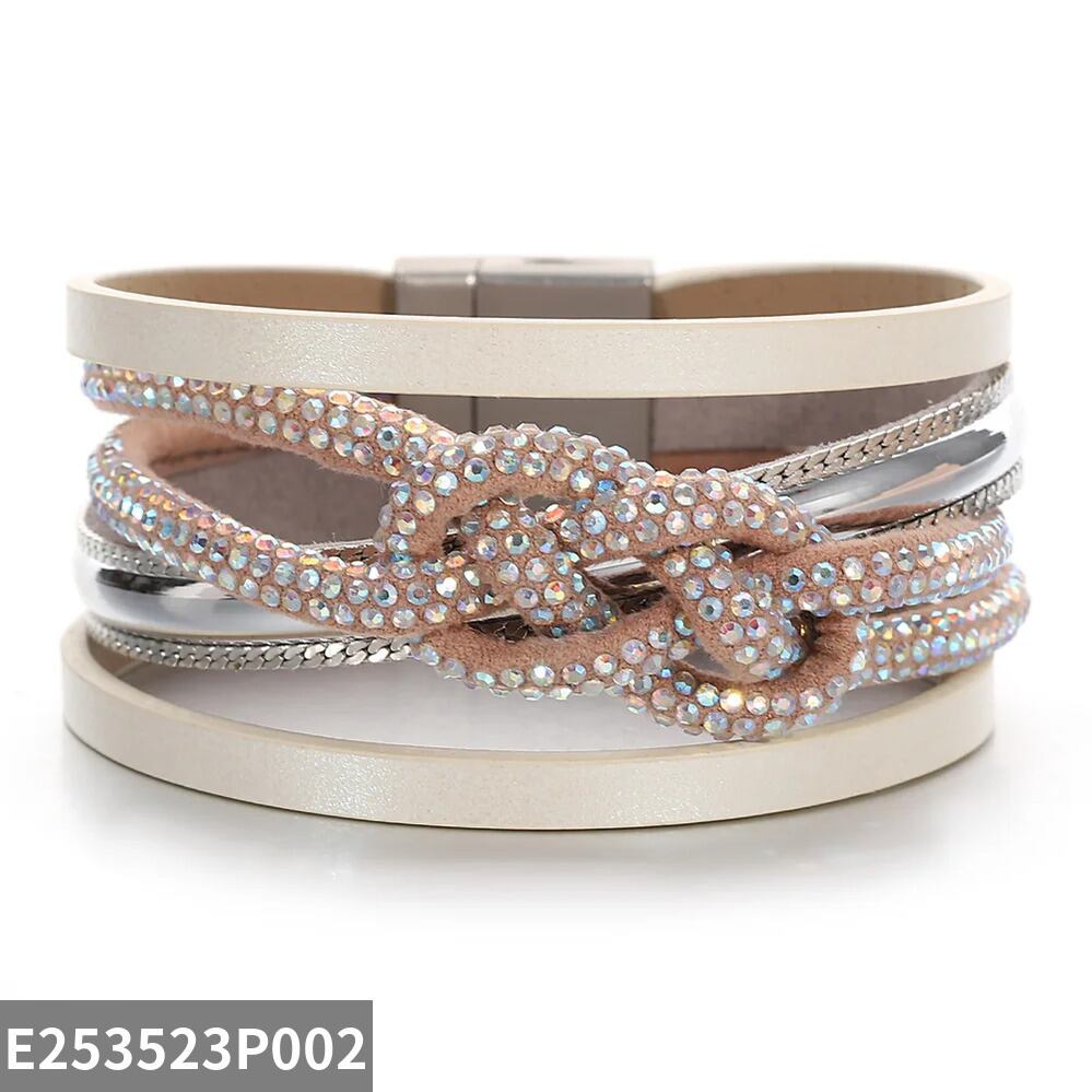 アクセ:レディースファッションダブルノット象嵌ラインストーンレザーブレスレット