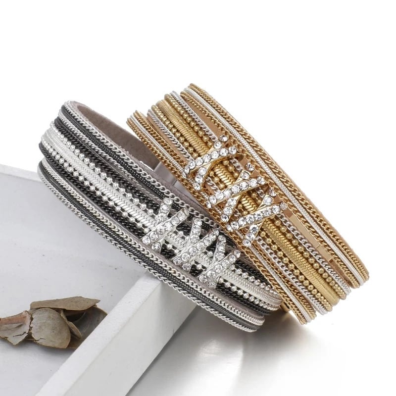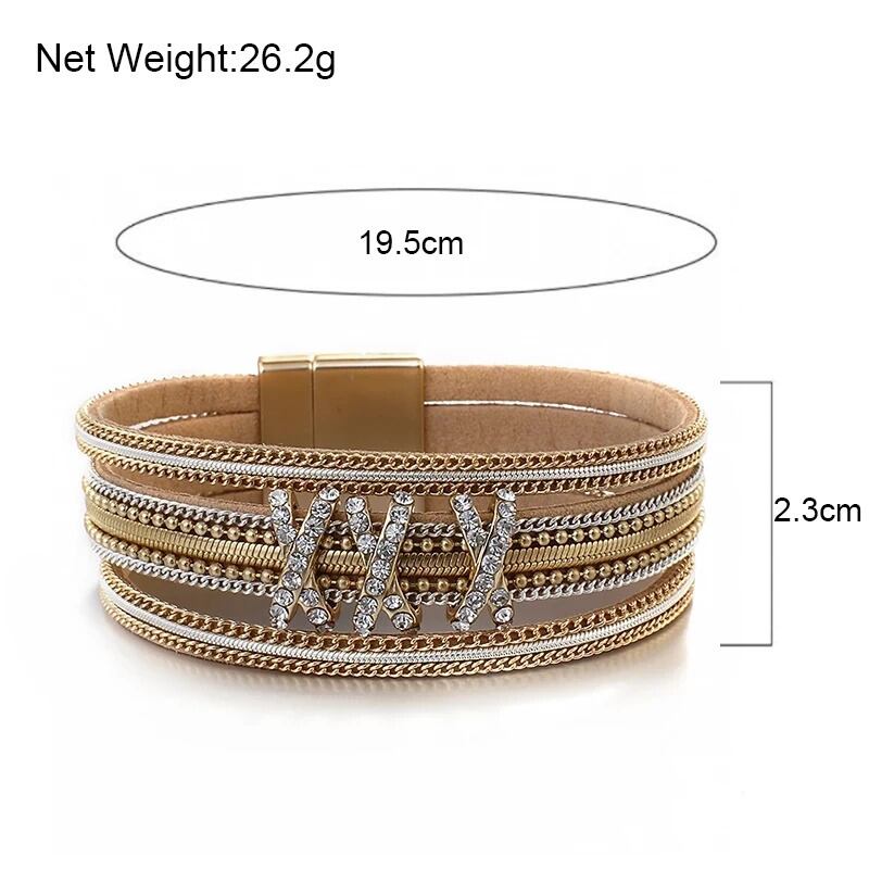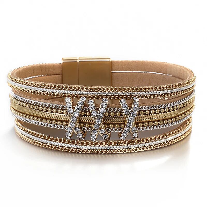 チャーム クリスタル X クロス レザー ブレスレット レディース ファッション メタル ビーズ チェーン 多層 マルチレイヤー ラップ バングル ジュエリー ギフト