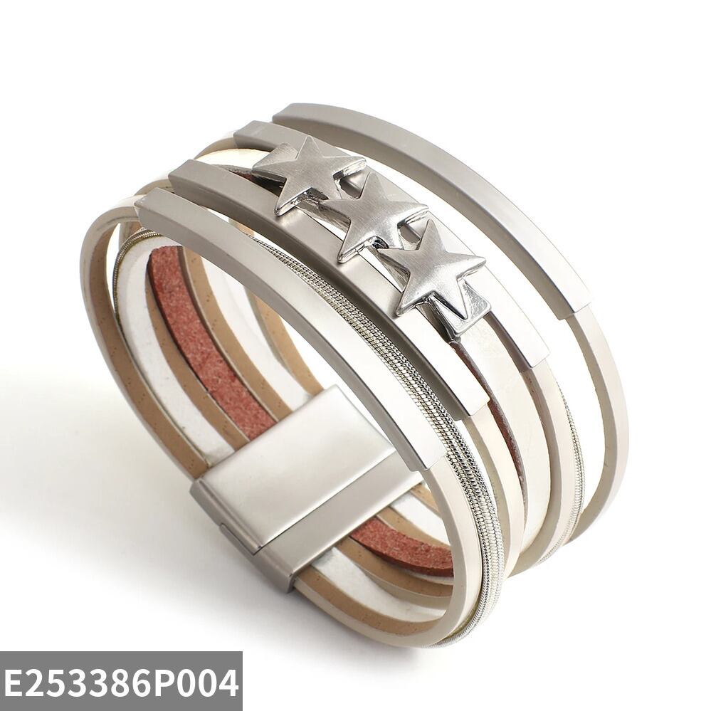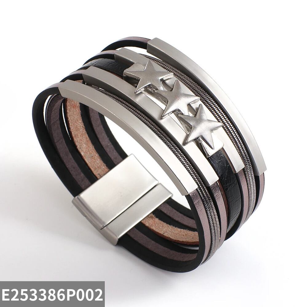 パンク スター 星 五芒星 レザー ブレスレット レディース 2024 ファッション 多層 マルチレイヤー メタル チューブ チェーン ラップ 幅 チャーム ジュエリー