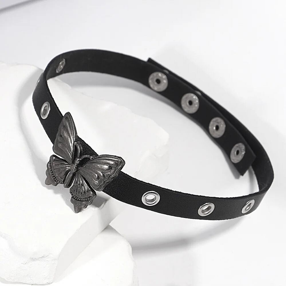 Y2K パンク メタル 蝶 バタフライ 昆虫 インセクト レザー チョーカー レディース ガール ビンテージ ヒップ ホップ リベット 黒 ブラック 鎖骨 ネックレス チャーム ジュエリー