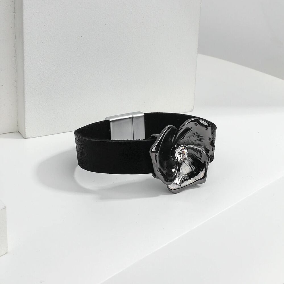 ビンテージ 銃 ガン 黒 ブラック 花 フラワー ラインストーン レザー ブレスレット レディース 磁気 マグネット マグネティック 留め金 クラスプ シンプル バングル チャーム ジュエリー
