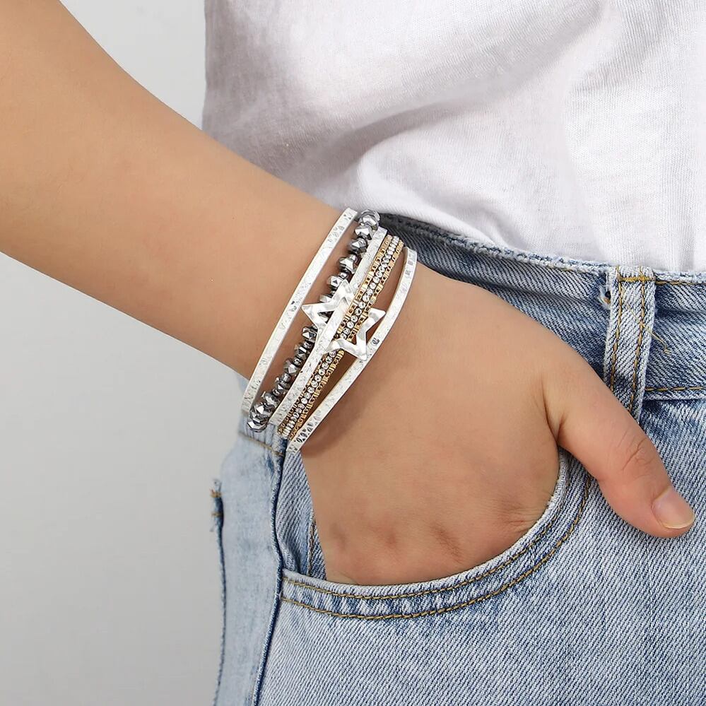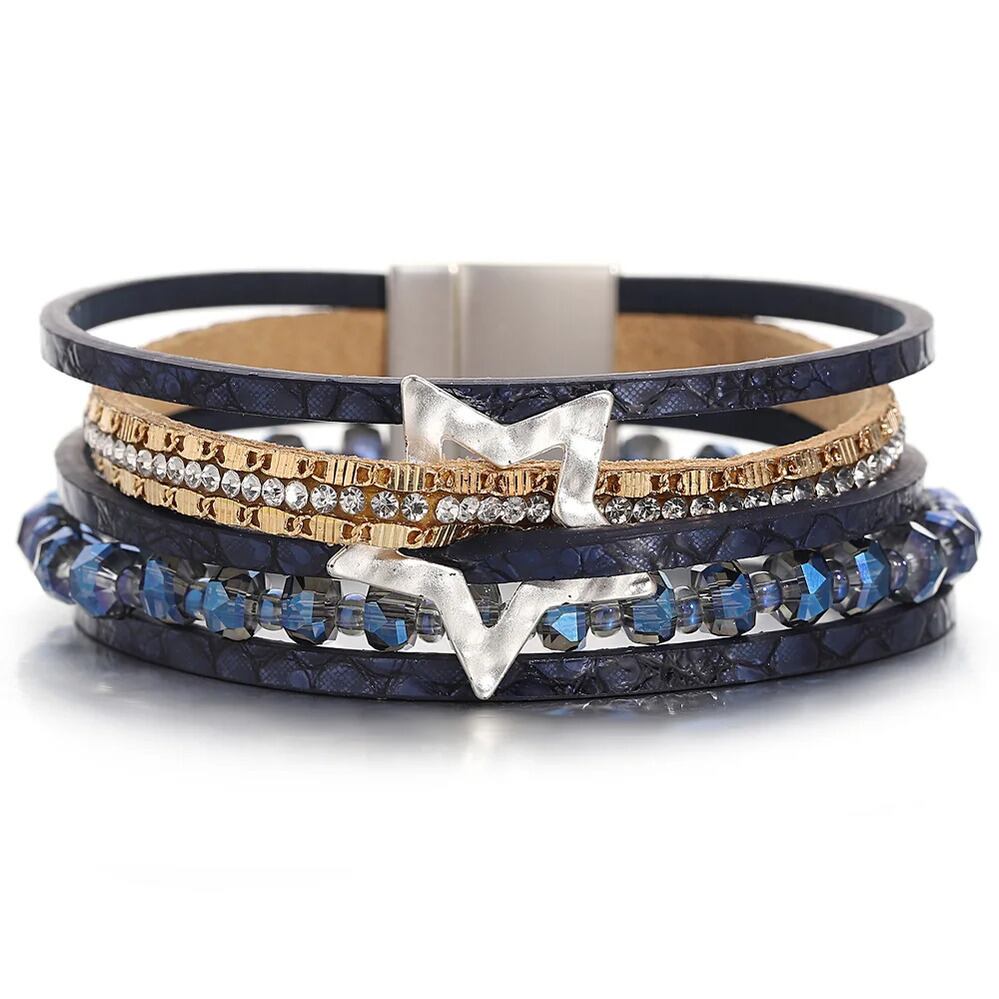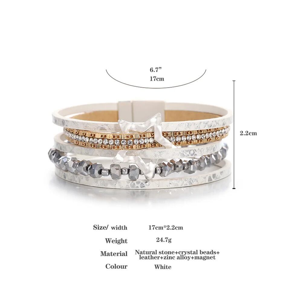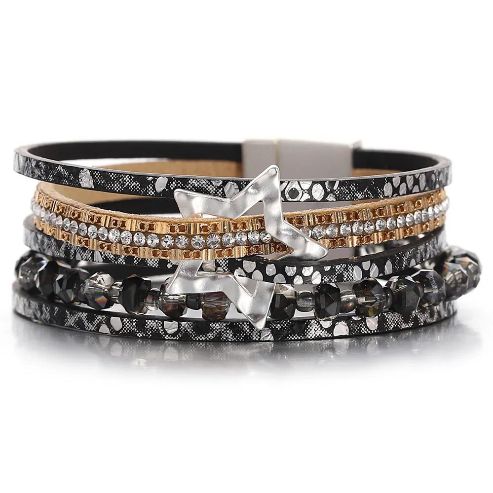 ファッション 透かし スター 星 蛇 スネイク ヘビ 動物 アニマル スキン 肌 レザー ブレスレット レディース チャーム クリスタル ビーズ チェーン 多層 マルチレイヤー ラップ ジュエリー ギフト