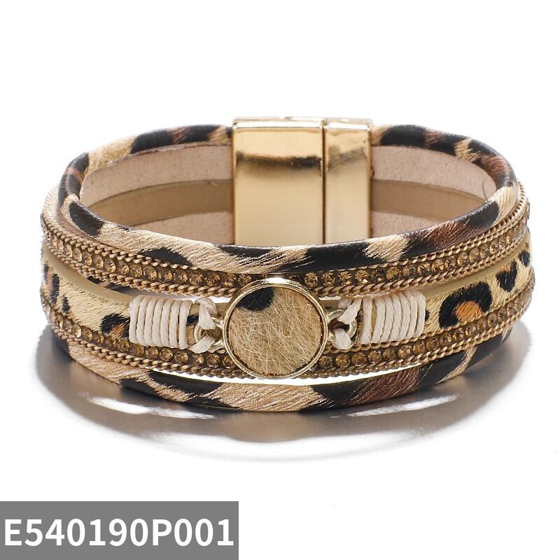 ボヘミアン ヒョウ レオパード 豹 動物 アニマル レザー ブレスレット レディース ビンテージ 多層 マルチレイヤー ラップ クリスタル チェーン  バングル ジュエリー ギフト