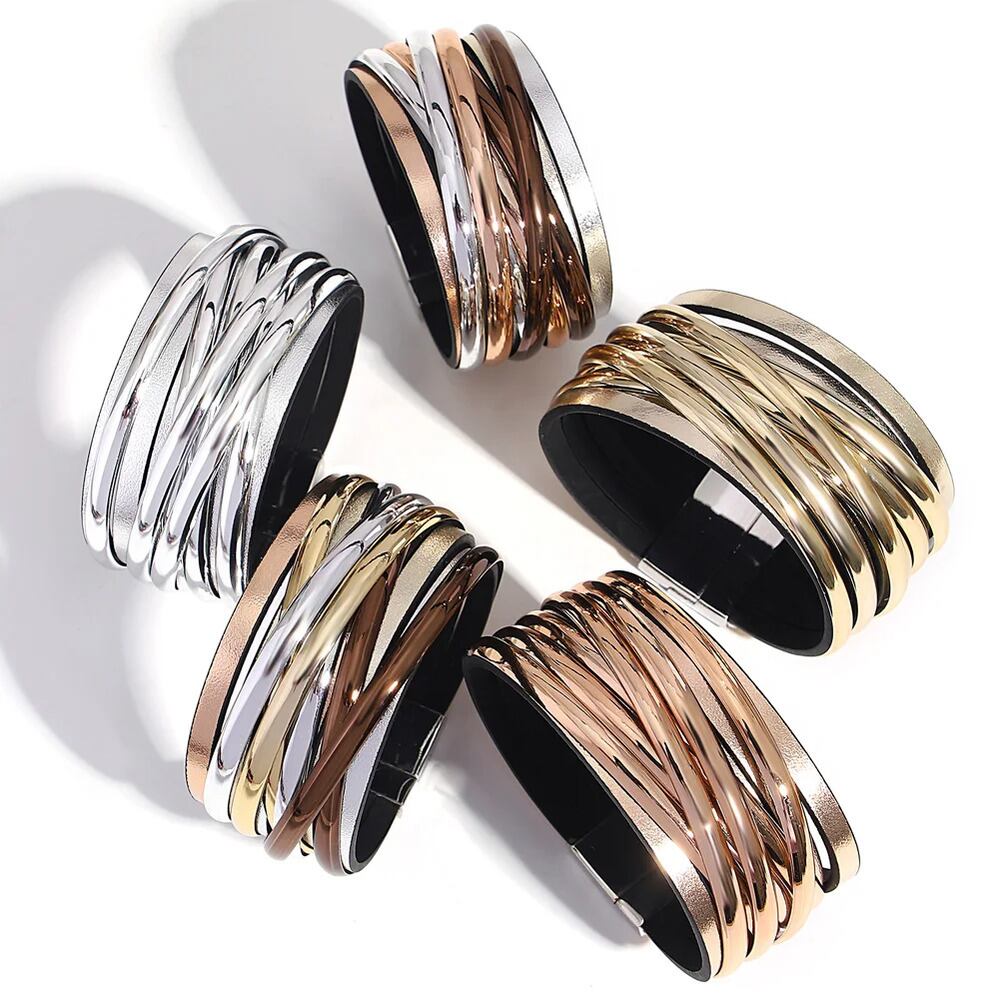 トレンド パンク クロス 光沢 レザー ブレスレット レディース チャーム BOHO 多層 マルチレイヤー ラップ 幅 バングル ジュエリー ギフト