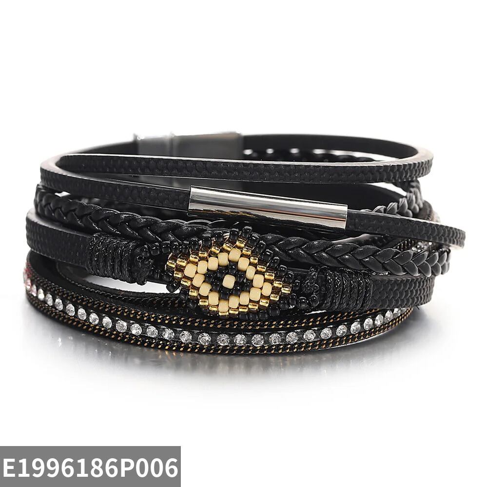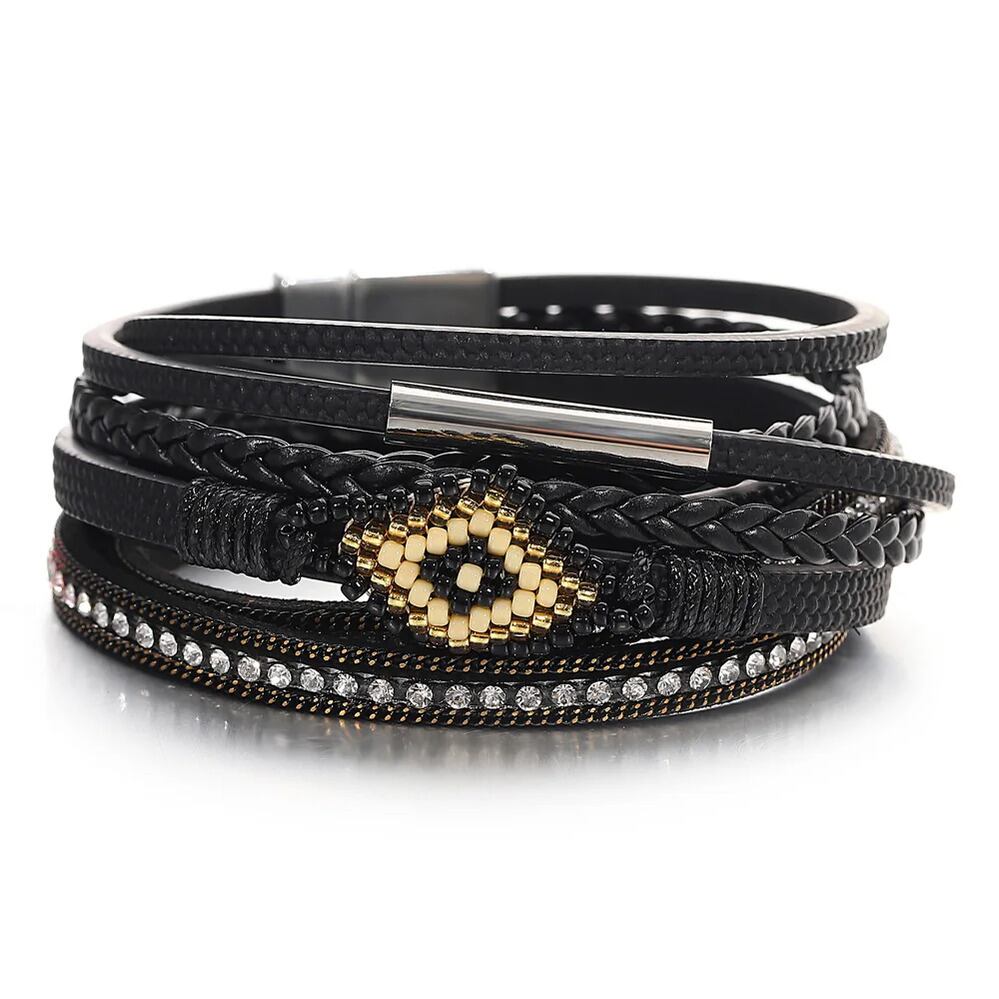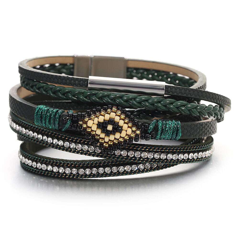 BOHO シード 種 ビーズ 悪 エビル 目 アイズ レザー ブレスレット レディース メンズ ハンドメイド 編組 多層 マルチレイヤー クリスタル ラップ パーティ ジュエリー