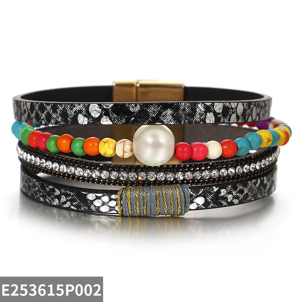 パール カラフル ストーン ビーズ レザー ブレスレット レディース ファッション 多層 マルチレイヤー ラインストーン チェーン ラップ ジュエリー ギフト
