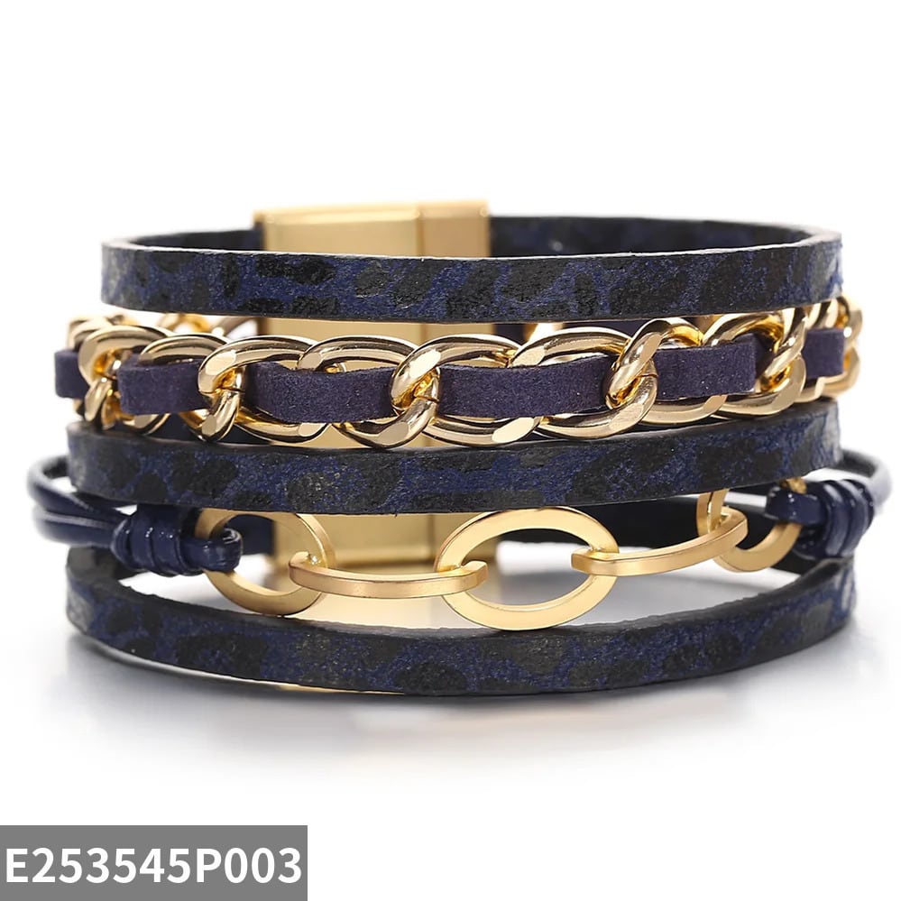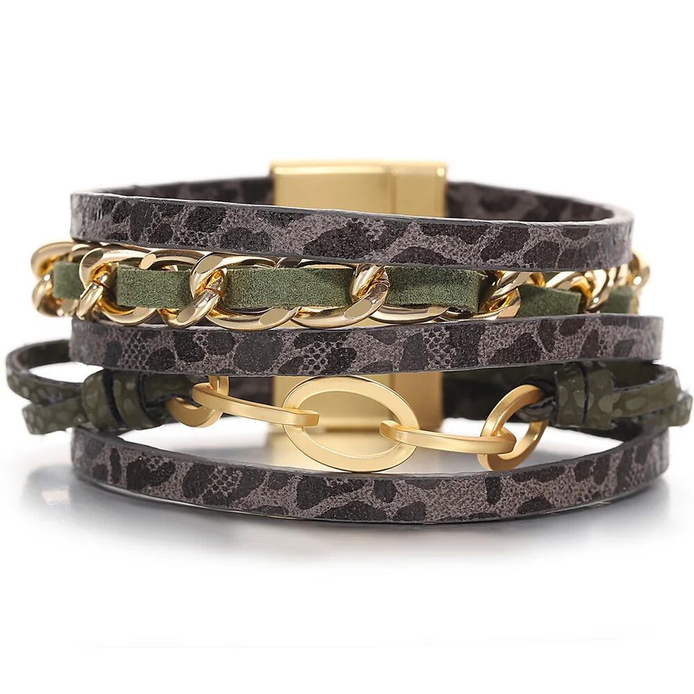 パンク チャーム 2 調子 メタル チェーン ブレスレット レディース レトロ BOHO 多層 マルチレイヤー ラップ ヒョウ レオパード 豹 動物 アニマル レザー パーティ ジュエリー