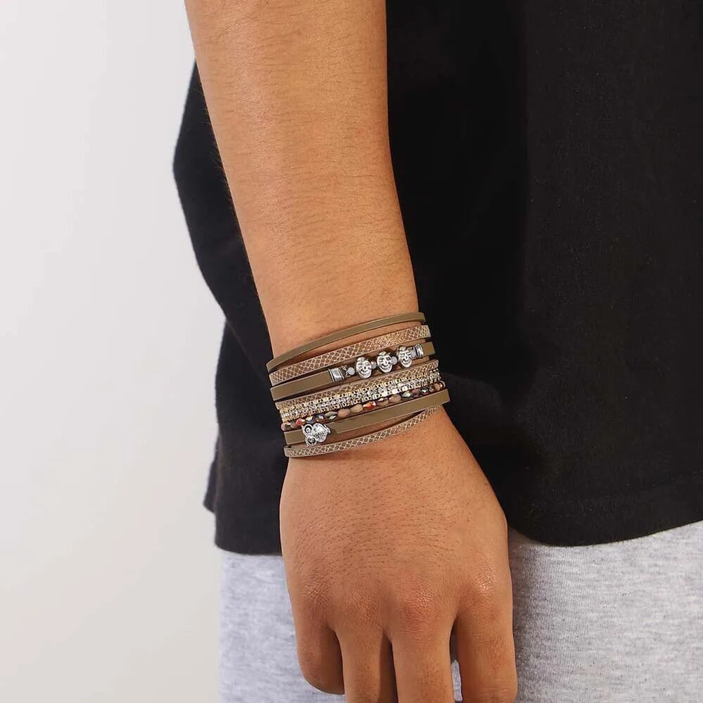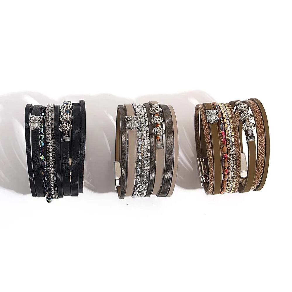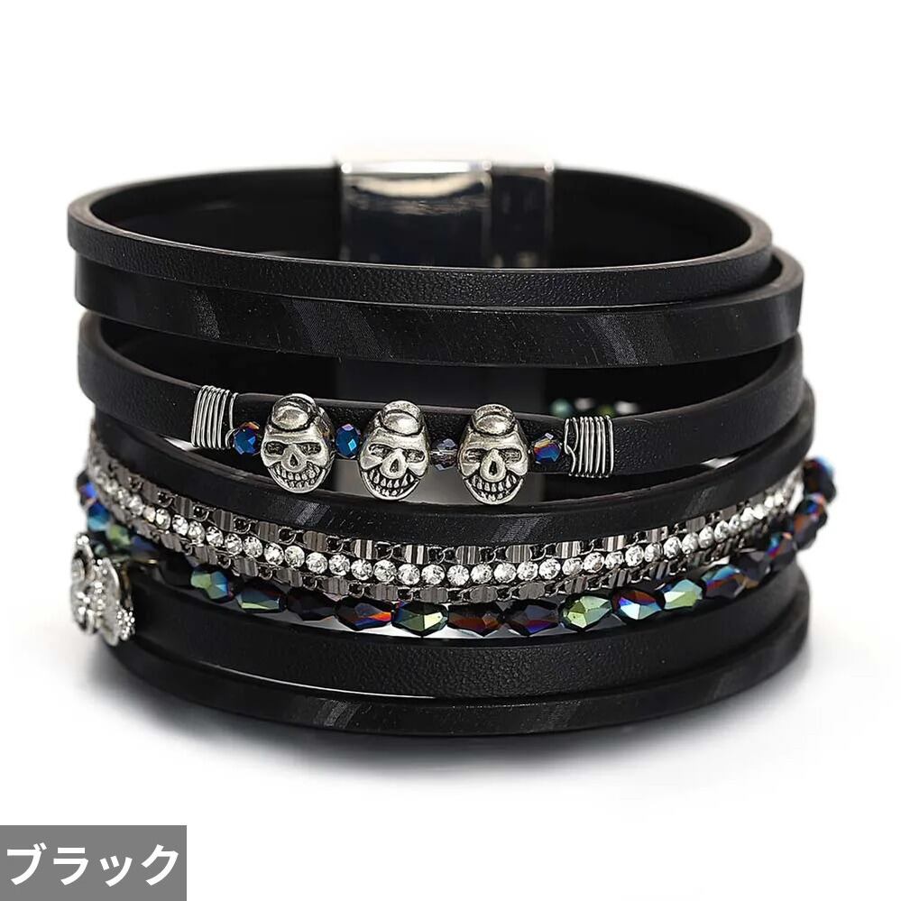ボヘミアン 頭蓋骨 スカル レザー ブレスレット チャーム ハンドメイド クリスタル ビーズ チェーン フクロウ 鳥 バード 多層 マルチレイヤー 幅 ラップ ハロウィーン ジュエリー