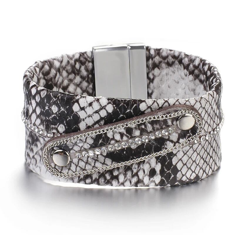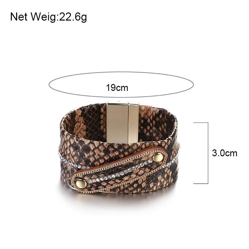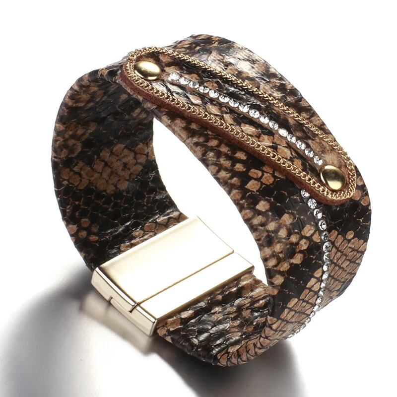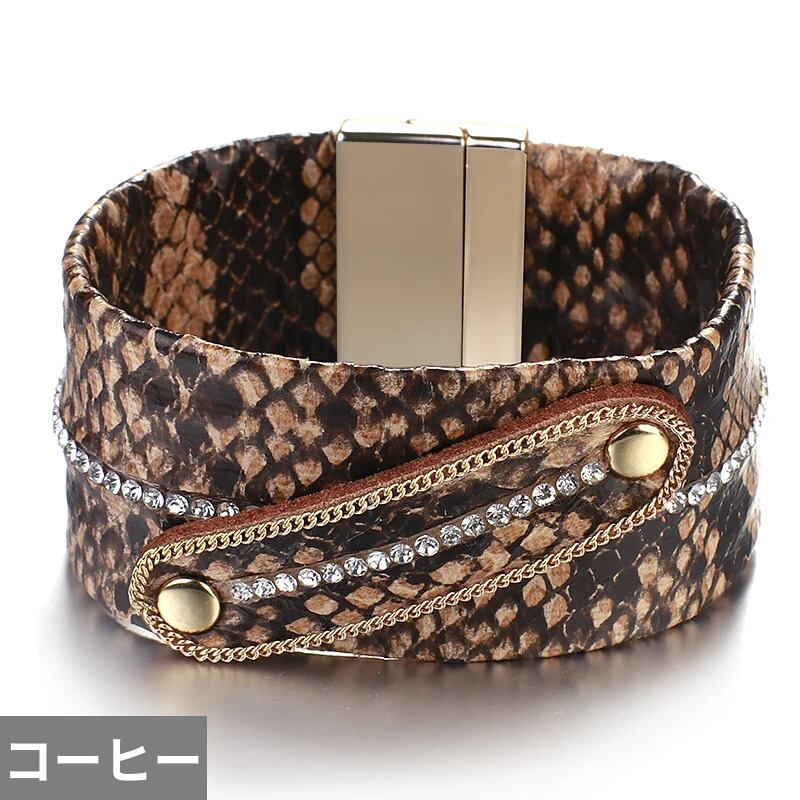BOHO 蛇 スネイク ヘビ 動物 アニマル レザー ブレスレット レディース ビンテージ チャーム 印刷 プリント ラインストーン チェーン 幅 ラップ パンク ジュエリー