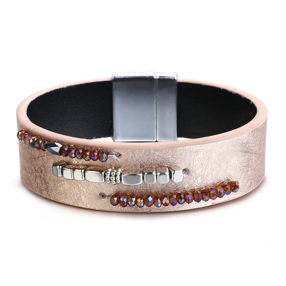 ビンテージ カラフル クリスタル ビーズ メタル キューブ レザー ブレスレット レディース シンプル 分厚い バングル チャーム ジュエリー