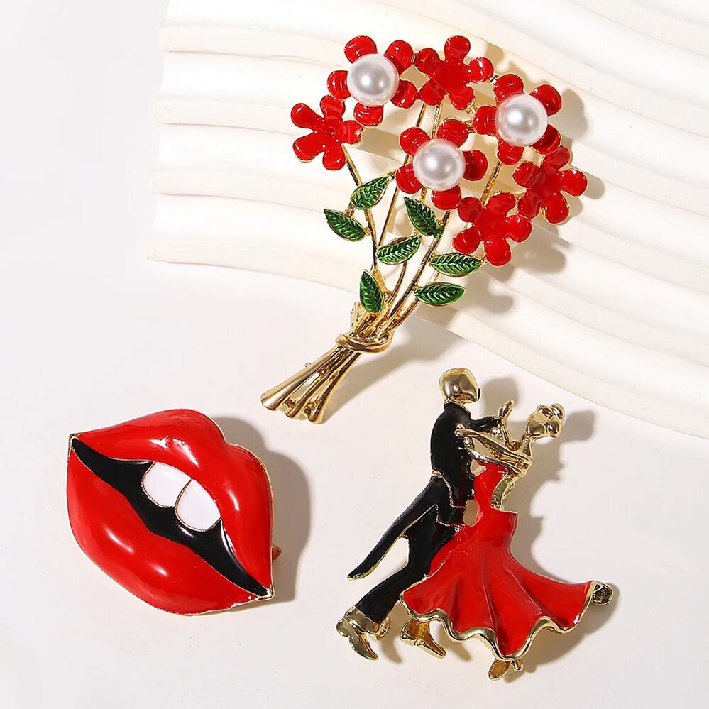 エレガント 赤 レッド エナメル ブローチ レディース ファッション ダンシング リップ パール ラインストーン 花 フラワー ピン ジュエリー バレンタイン 日 ギフト