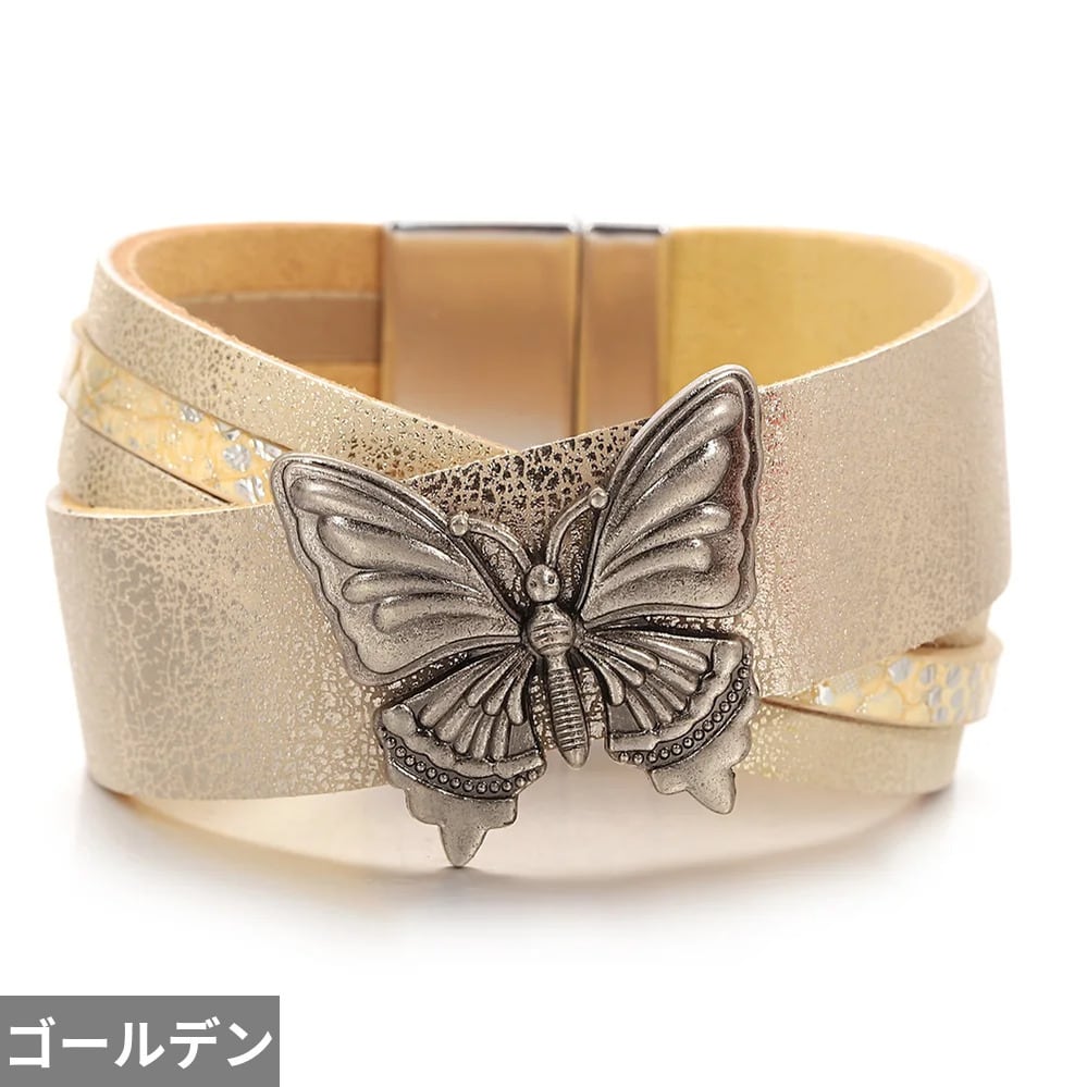 ビンテージ メタル 蝶 バタフライ 昆虫 インセクト 装飾 レザー ブレスレット レディース メンズ シンプル クロス ラップ 幅 バングル チャーム ジュエリー
