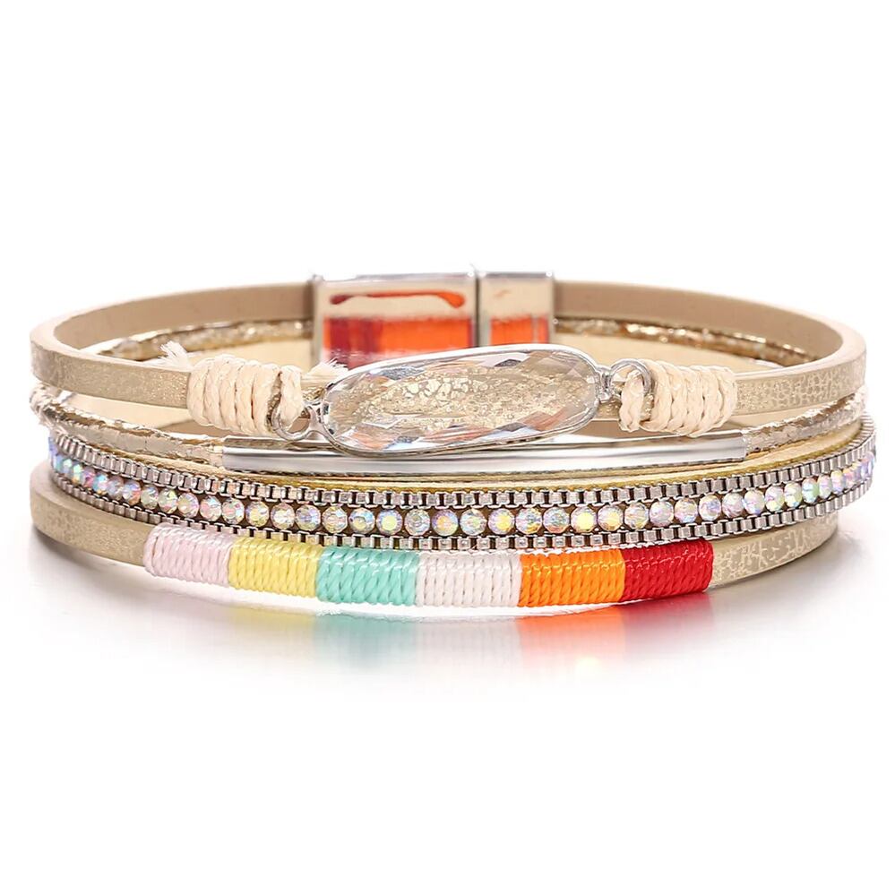 レトロ カラフル ロープ 編組 レザー ブレスレット レディース BOHO クリスタル ラインストーン 多層 マルチレイヤー ラップ エスニック ジュエリー