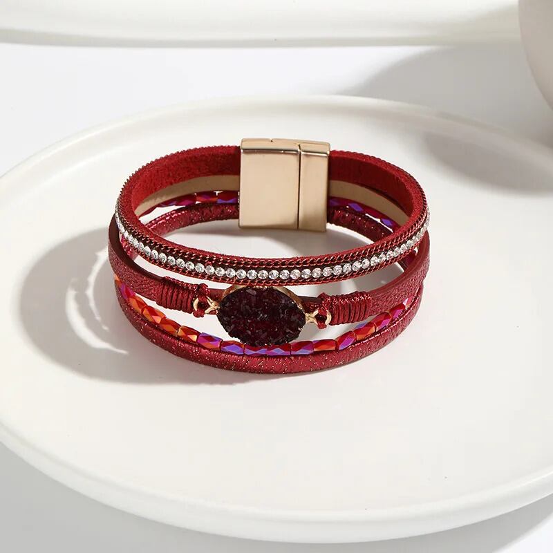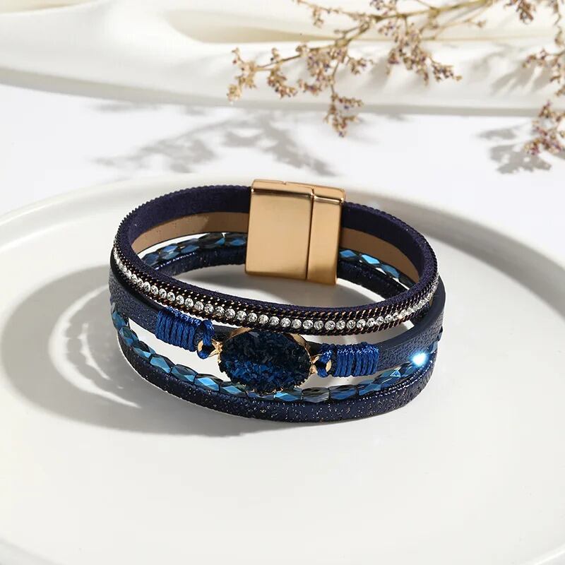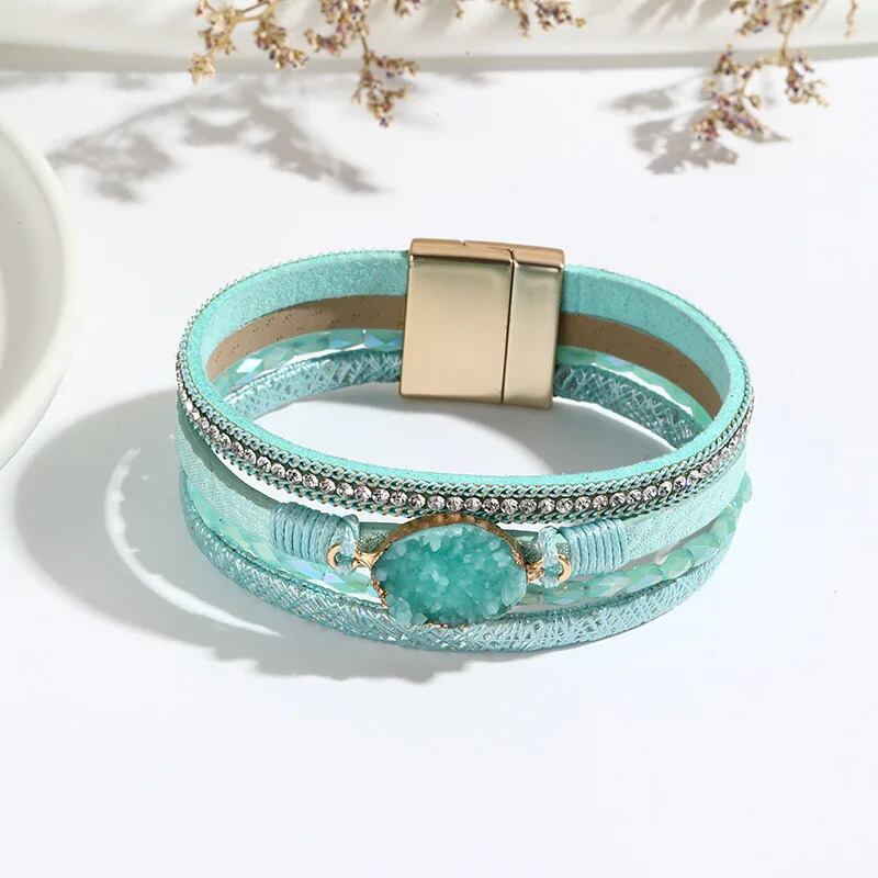 レトロ レジン ストーン ブレスレット レディース ボヘミアン 多層 マルチレイヤー クリスタル チェーン ラップ レザー バングル ジュエリー ギフト