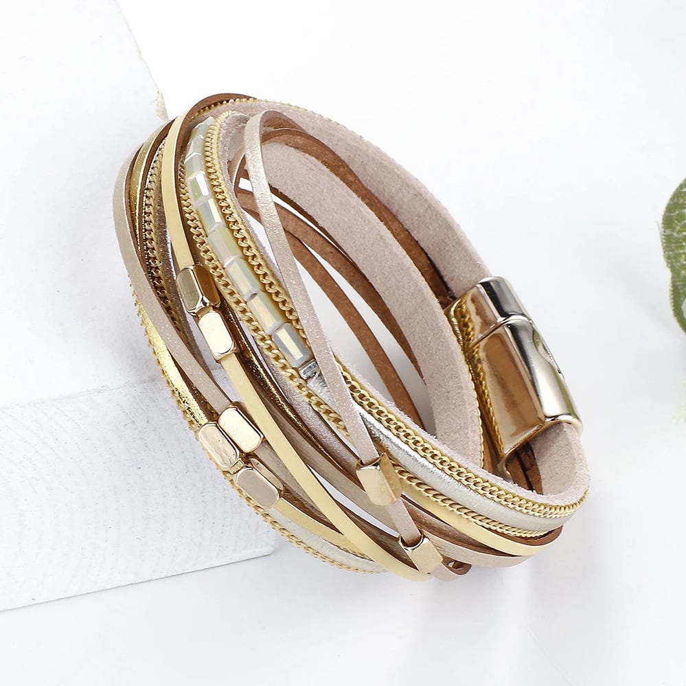 ビンテージ メタル ビーズ ロング レザー ブレスレット レディース 磁気 マグネット マグネティック バックル BOHO シンプル 多層 マルチレイヤー ラップ チャーム ジュエリー