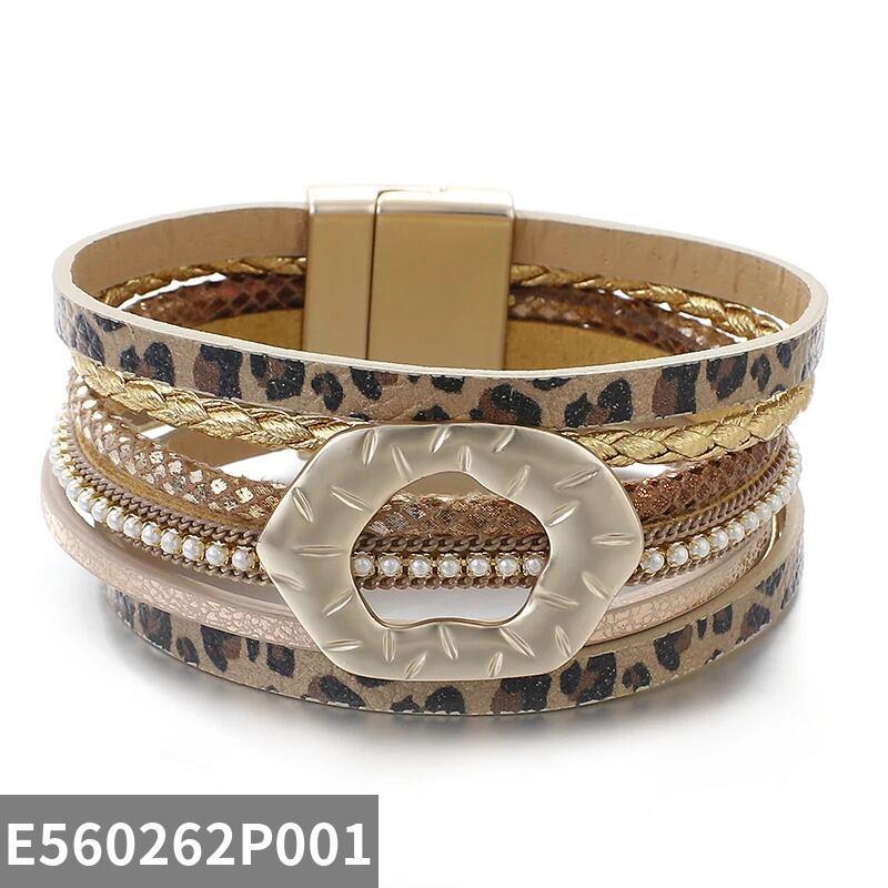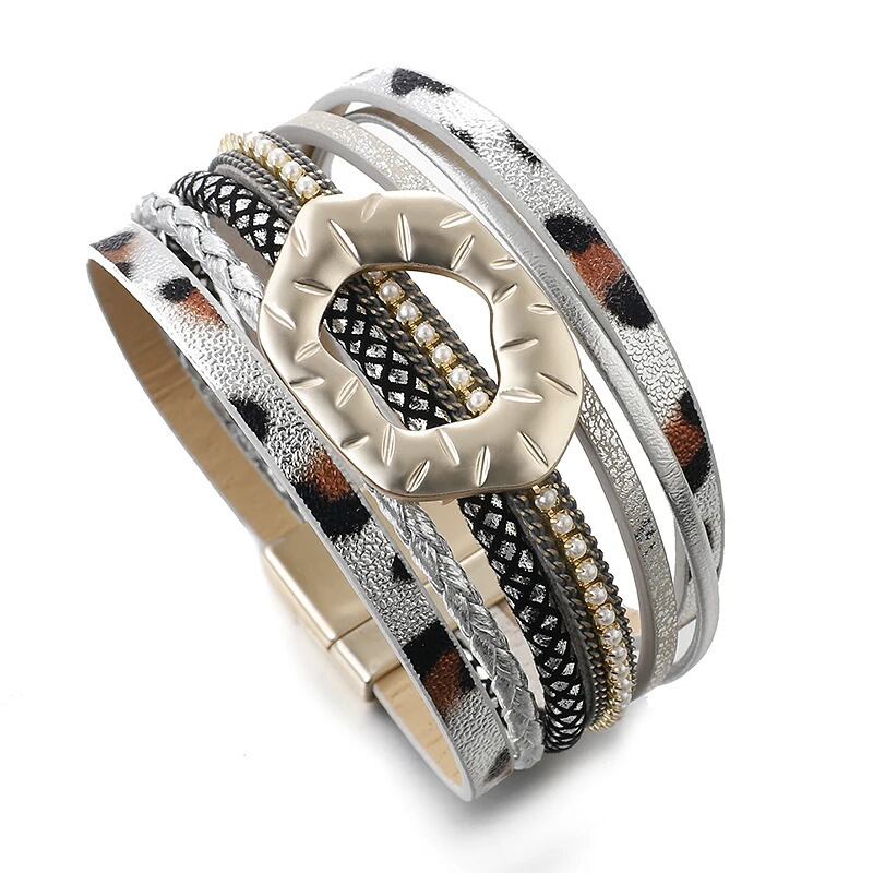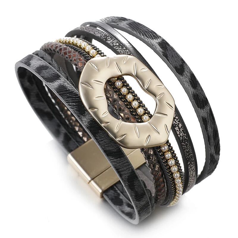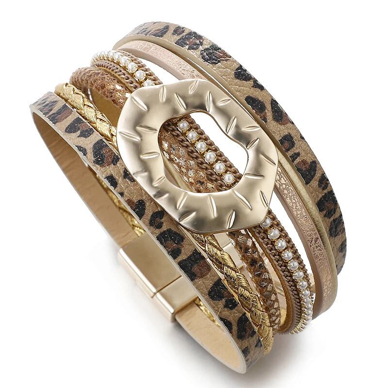 レトロ 透かし 幾何学 メタル ブレスレット レディース パール チェーン 多層 マルチレイヤー ラップ ヒョウ レオパード 豹 動物 アニマル レザー パーティ ジュエリー
