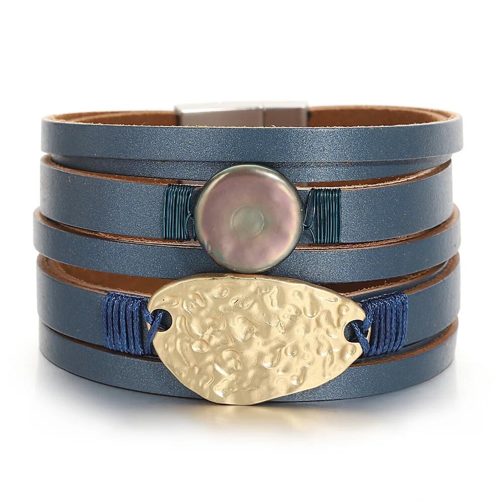 多層 マルチレイヤー レザー ブレスレット レディース イレギュラー ナチュラル パール 幾何学 メタル ラップ バングル チャーム ジュエリー