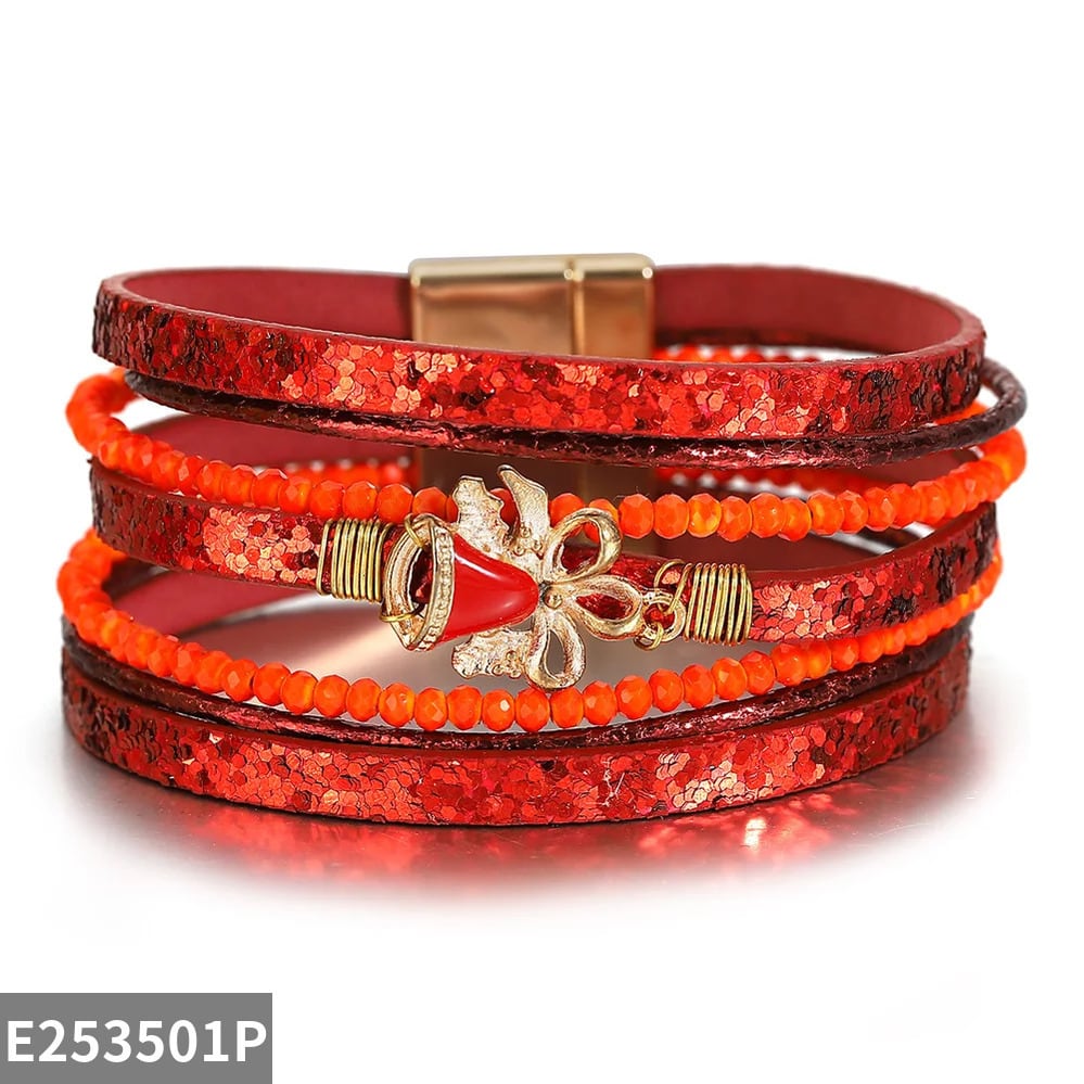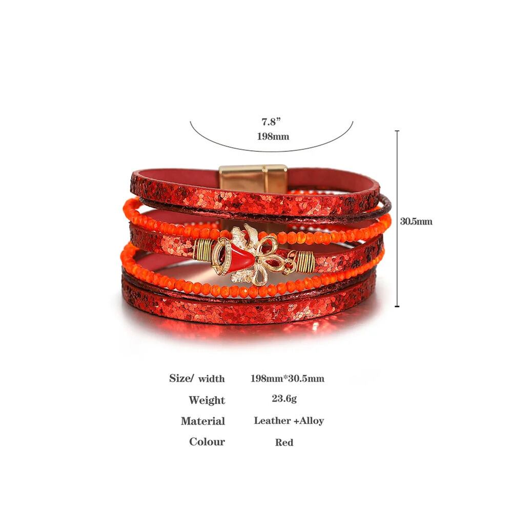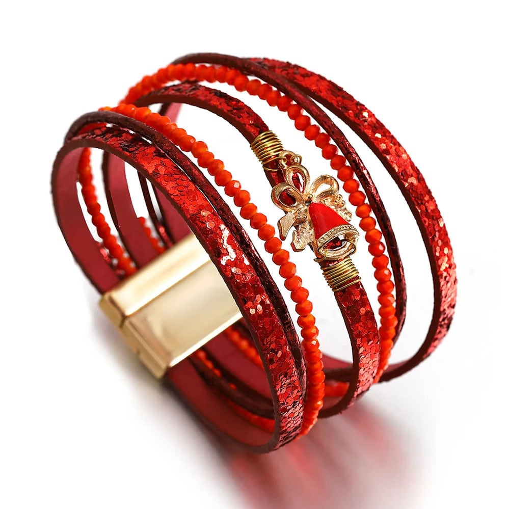 シャイニー 赤 レッド ベル スパンコール レザー ブレスレット レディース ファッション クリスタル ビーズ 多層 マルチレイヤー ラップ 幅 クリスマス ギフト