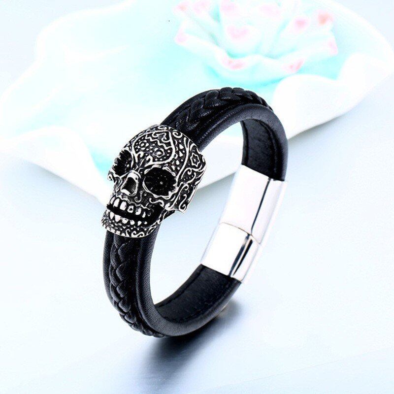 クール パンク ダブル スケルトン ブレスレット 316 ステンレス LOVE バングル レザー ジュエリー