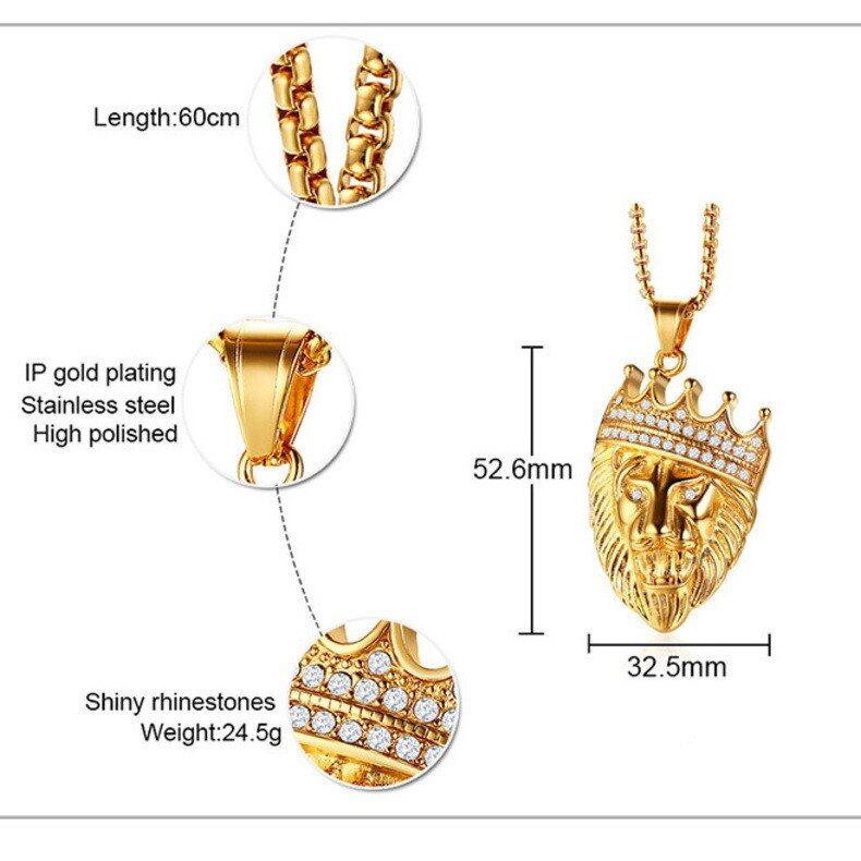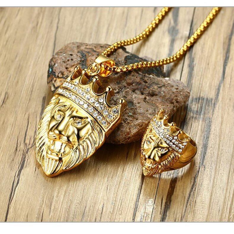 ゴールド トーン ライオン ヘッド セット メンズ ロック パンク ステンレス リング 指輪 ネックレス アクセサリー メンズ ボーイ パーティー