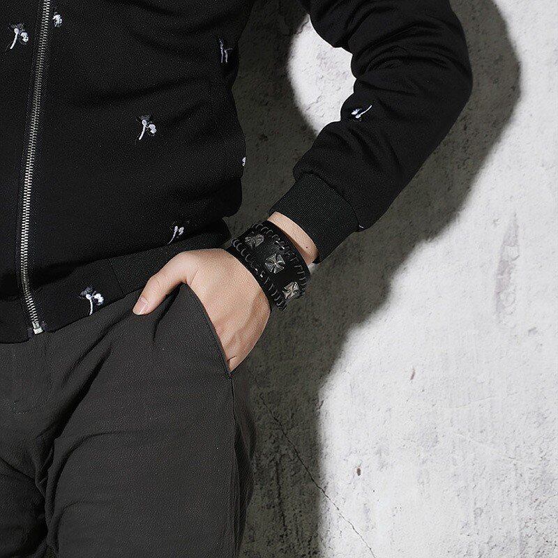 メンズ ロック バイカー レザー ブレスレット トリプル 鉄 クロス リストバンド フリーサイズ ブレスレット メンズ 騎士 クロス メンズ