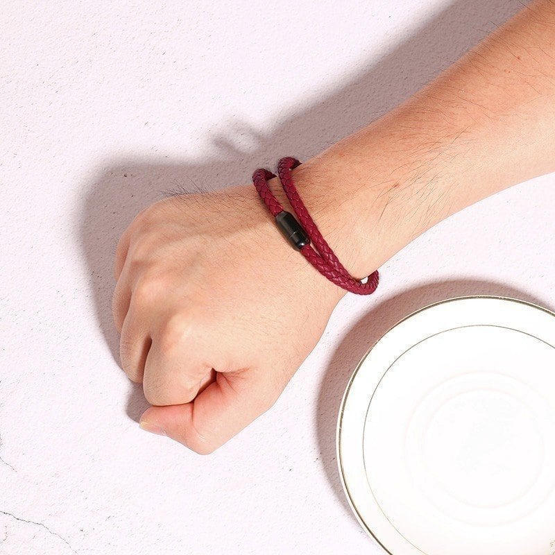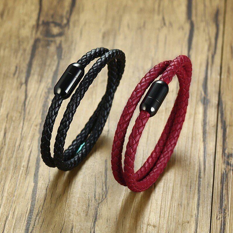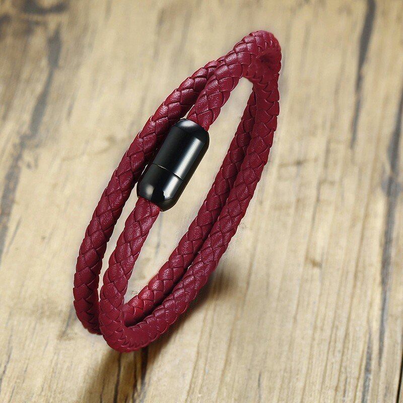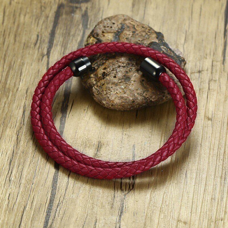 ユニーク 赤 編み レザー ロング ブレスレット レディース メンズ マグネティック 留め金 リアル ステンレス バングル ユニセックス