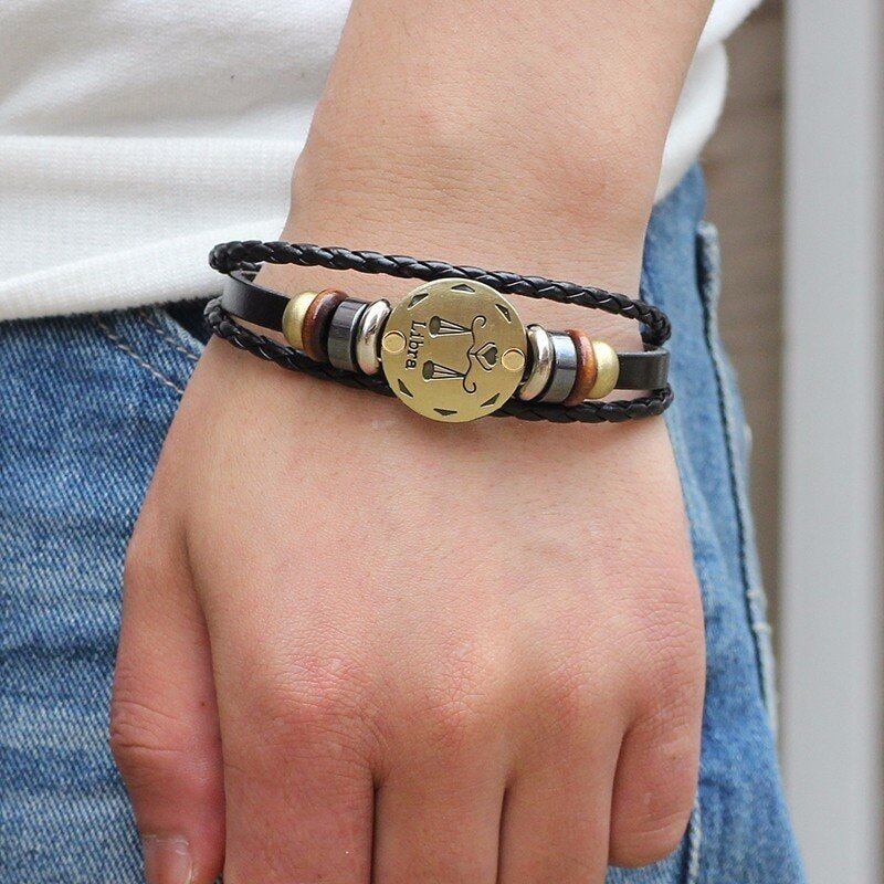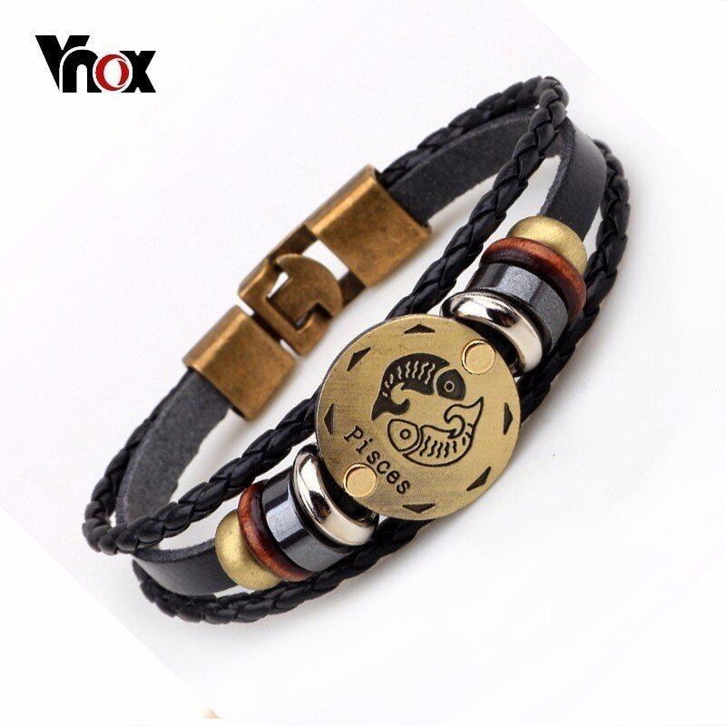 12 星座 ヘマタイト マグネティック ビーズ チャーム ブレスレット メンズ ブラウン マルチ レイヤー レザー メンズ 20cm