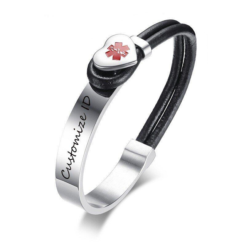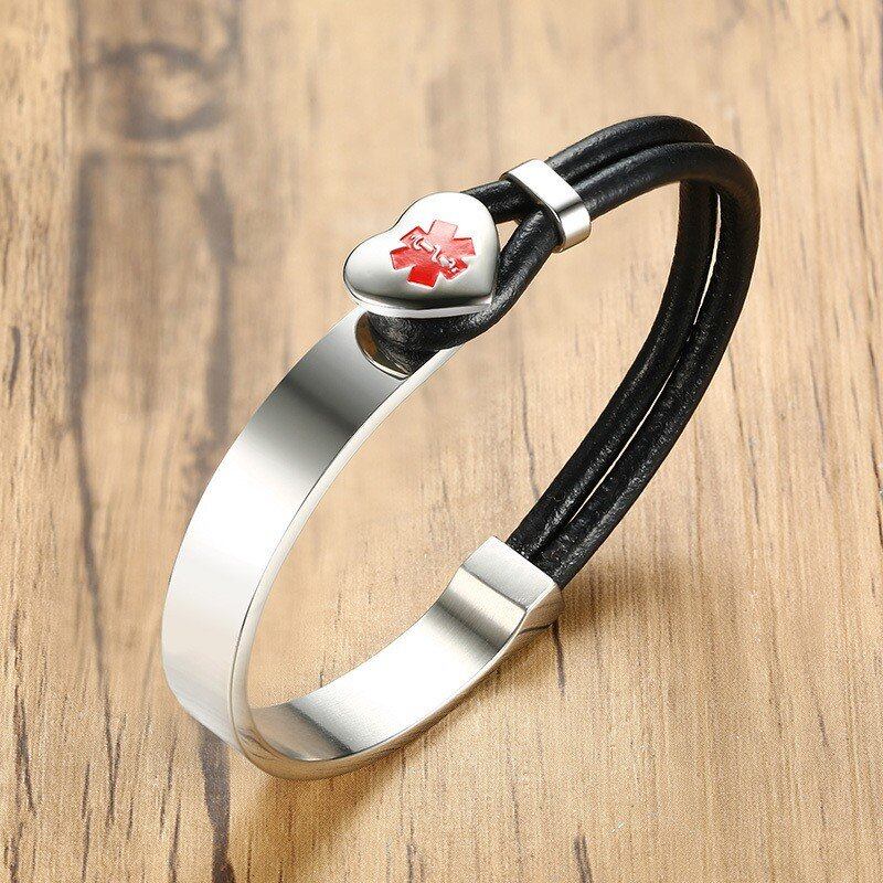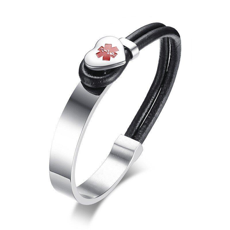 メディカル アラート ブレスレット レディース メンズ ハート チャーム ステンレス ラップ ブレスレット バングル ブラック レザー ロープ