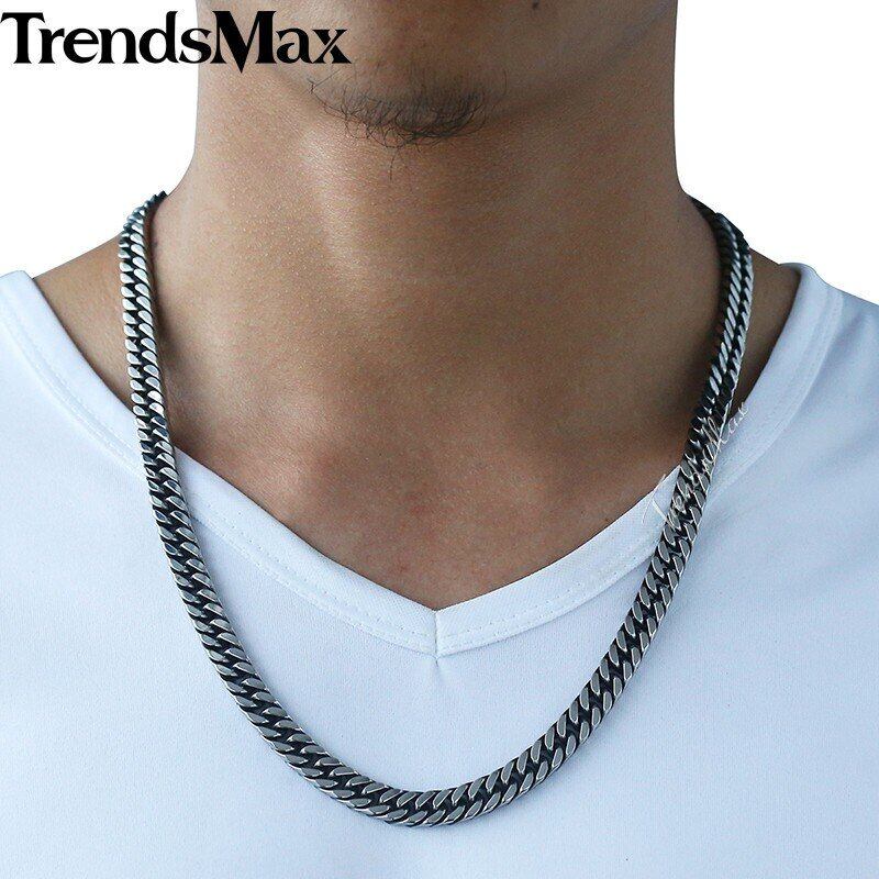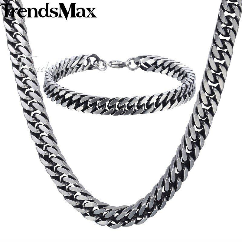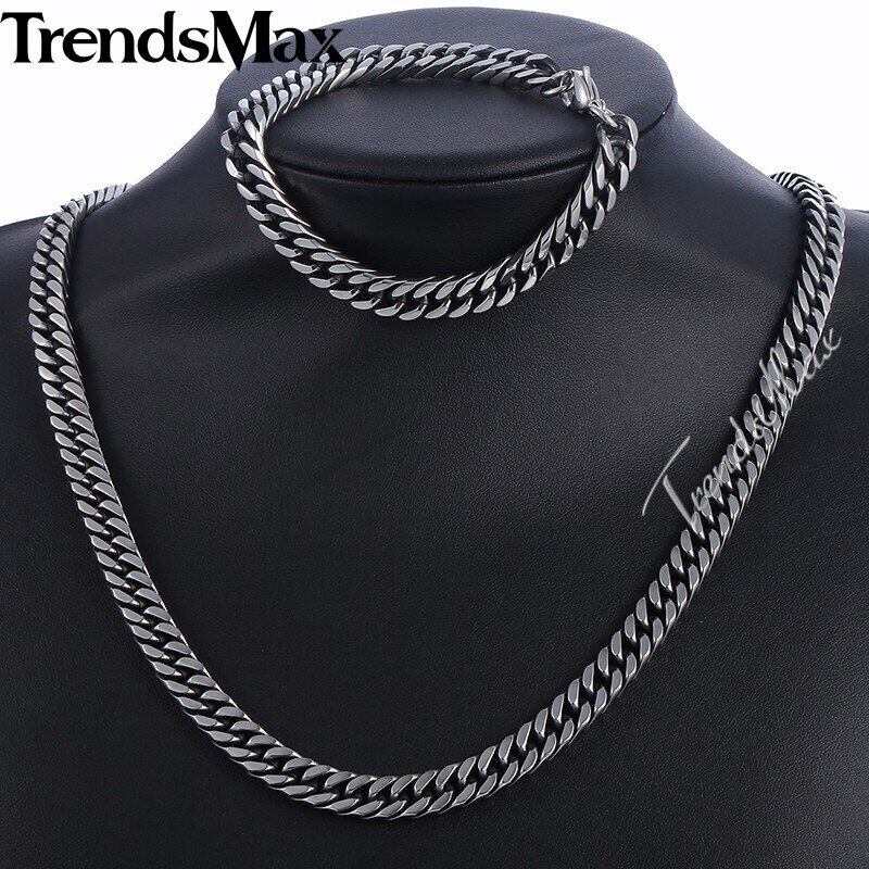 セット メンズ ネックレス ブレスレット ステンレス チェーン ガンメタル ダブル カーブ キューバの リンク