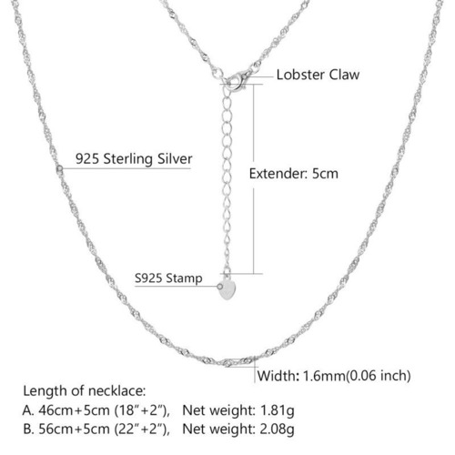 925 スターリング シルバー シルバー チェーン 1.6mm 水 波 チェーン シンプル ネックレス スリム チェーン 46.55cm