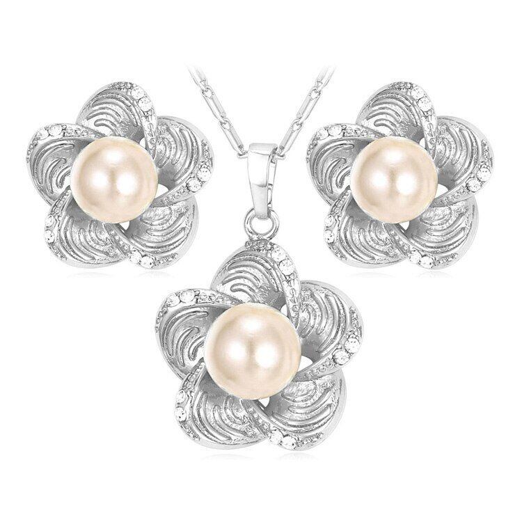 ブランド フラワー セット シルバー/ カラー トレンディー シミュレー パール ブライダル スタッド ピアス ネックレス セット