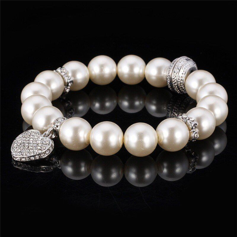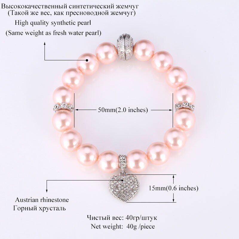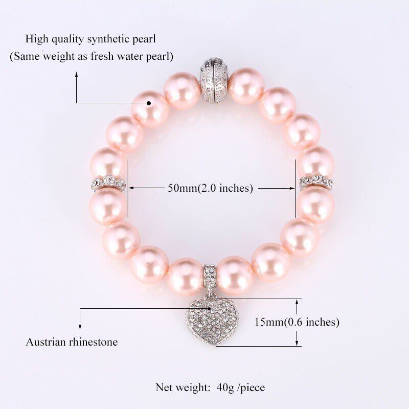 白 パール ブレスレット トレンディー ラウンド パール ラインストーン ハート ビーチ ピンク ブレスレット